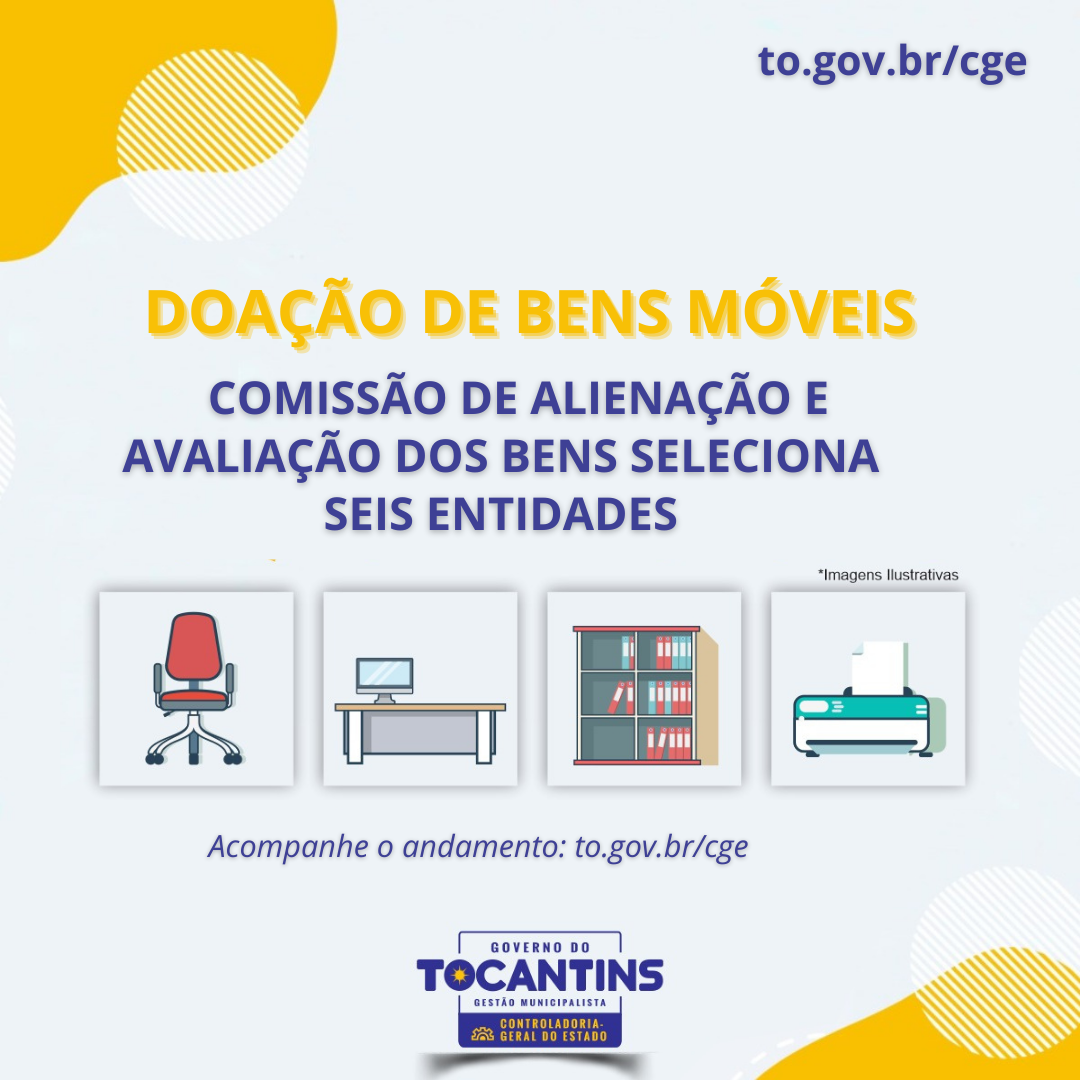 O Governo do Tocantins, por meio da Controladoria-Geral do Estado do Tocantins (CGE-TO) fará a doação de bens patrimoniais considerados inservíveis a seis instituições sem fins lucrativos, sendo: Associação de Pais e Amigos dos Excepcionais de Palmas (Apae), Associação Ação Social Jesus de Nazaré, Associação Cultural de Dança Sombras do Hip Hop, Instituto Brasil Sustentável, Instituto Brasileiro Amigos da Vida e Loja Maçônica Mensageiros da Luz.
