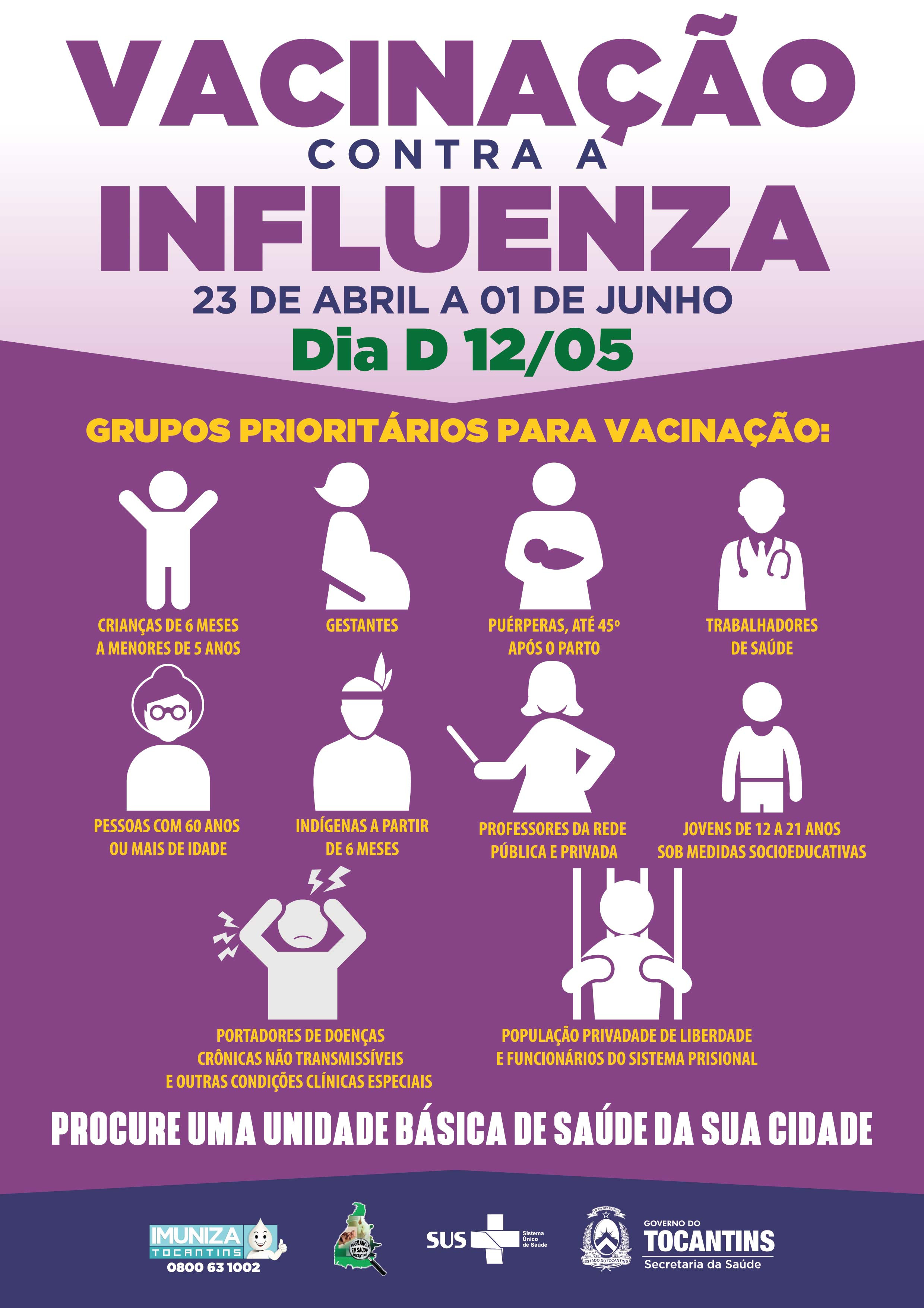 O Ministério da Saúde, por meio da Coordenação-Geral do Programa Nacional de Imunizações, do Departamento de Vigilância das Doenças Transmissíveis, da Secretaria de Vigilância em Saúde, lança a 20ª Campanha Nacional de Vacinação contra a Influenza, em parceria com os Estados e municípios, no período de 23 de abril a 01 de junho de 2018, sendo 12 de maio, o dia de mobilização nacional.