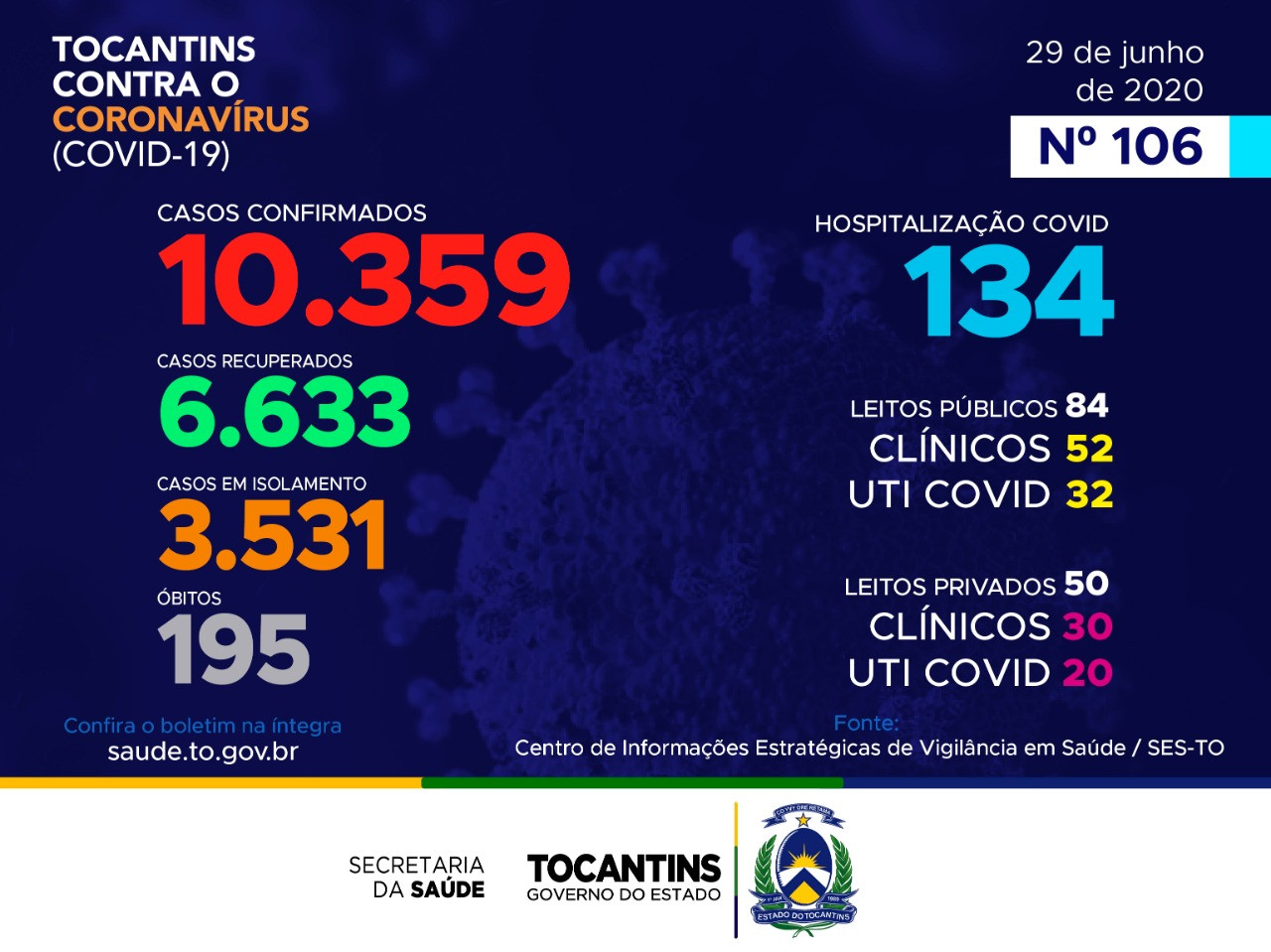 👉🏼 Atualmente, o Tocantins apresenta 10.359 casos no total, destes, 6.633 pacientes estão recuperados, 3.531 pacientes estão ainda em isolamento domiciliar ou hospitalar e 195 pacientes foram a óbito.