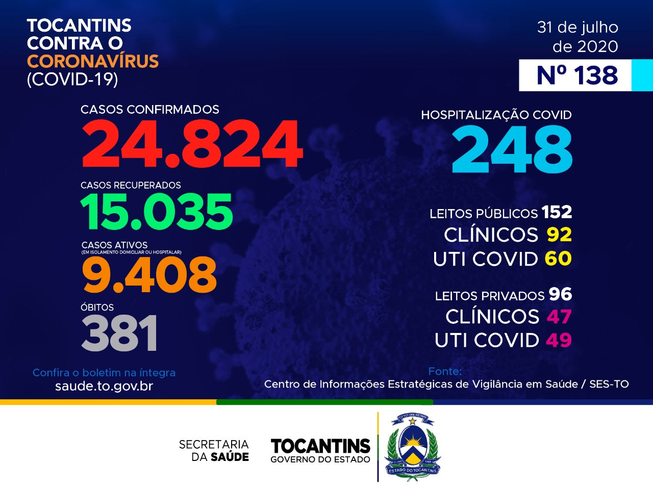👉🏼 Atualmente, o Tocantins apresenta 24.824 casos no total, destes, 15.035 pacientes estão recuperados, 9.408 pacientes estão ainda em isolamento domiciliar ou hospitalar e 381 pacientes foram a óbito.
