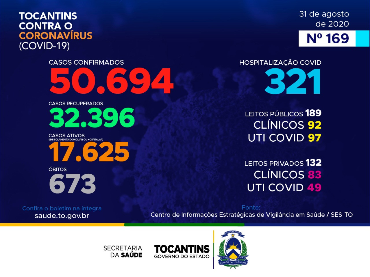 👉🏼 Atualmente, o Tocantins apresenta 50.694 casos no total, destes, 32.396 pacientes estão recuperados, 17.625 pacientes estão ainda em isolamento domiciliar ou hospitalar e 673 pacientes foram a óbito.