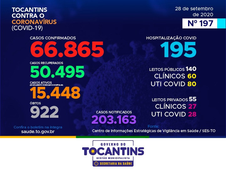 👉🏼 Atualmente, o Tocantins contabiliza 203.163 pessoas notificadas com a Covid-19 e acumula 66.865 casos confirmados. Destes, 50.495 pacientes estão recuperados, 15.448 pacientes seguem em isolamento domiciliar ou hospitalar e 922 pacientes foram a óbito.