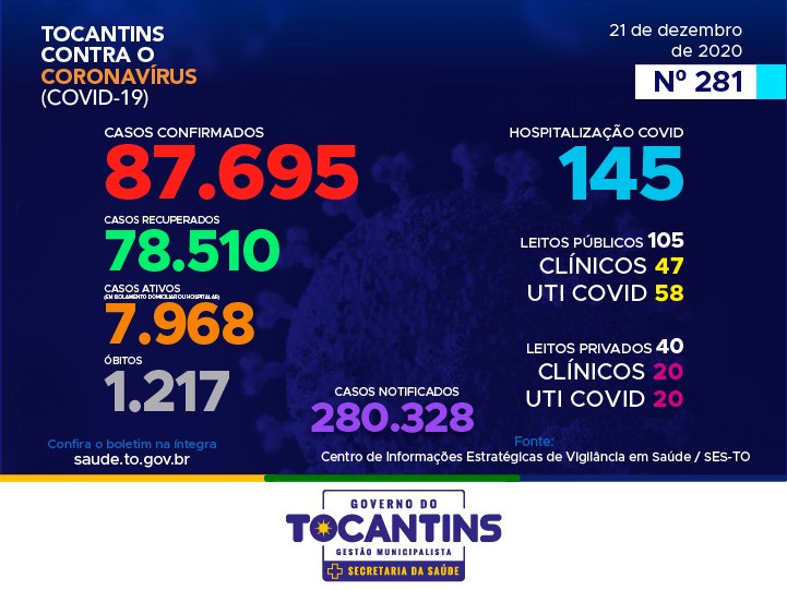 👉🏼 Atualmente, o Tocantins contabiliza 280.328 pessoas notificadas com a Covid-19 e acumula 87.695 casos confirmados. Destes, 78.510 pacientes estão recuperados, 7.968 pacientes seguem em isolamento domiciliar ou hospitalar e 1.217 pacientes foram a óbito.