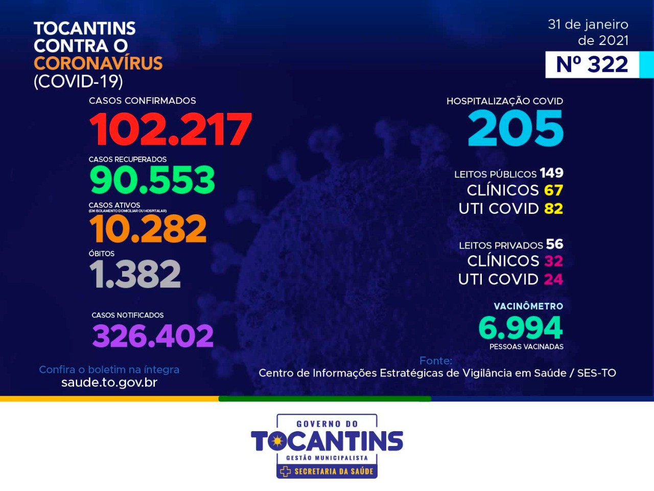 👉🏼 Atualmente, o Tocantins contabiliza 326.402 pessoas notificadas com a Covid-19 e acumula 102.217 casos confirmados. Destes, 90.553 pacientes estão recuperados, 10.282 pacientes seguem em isolamento domiciliar ou hospitalar e 1.382 pacientes foram a óbito.