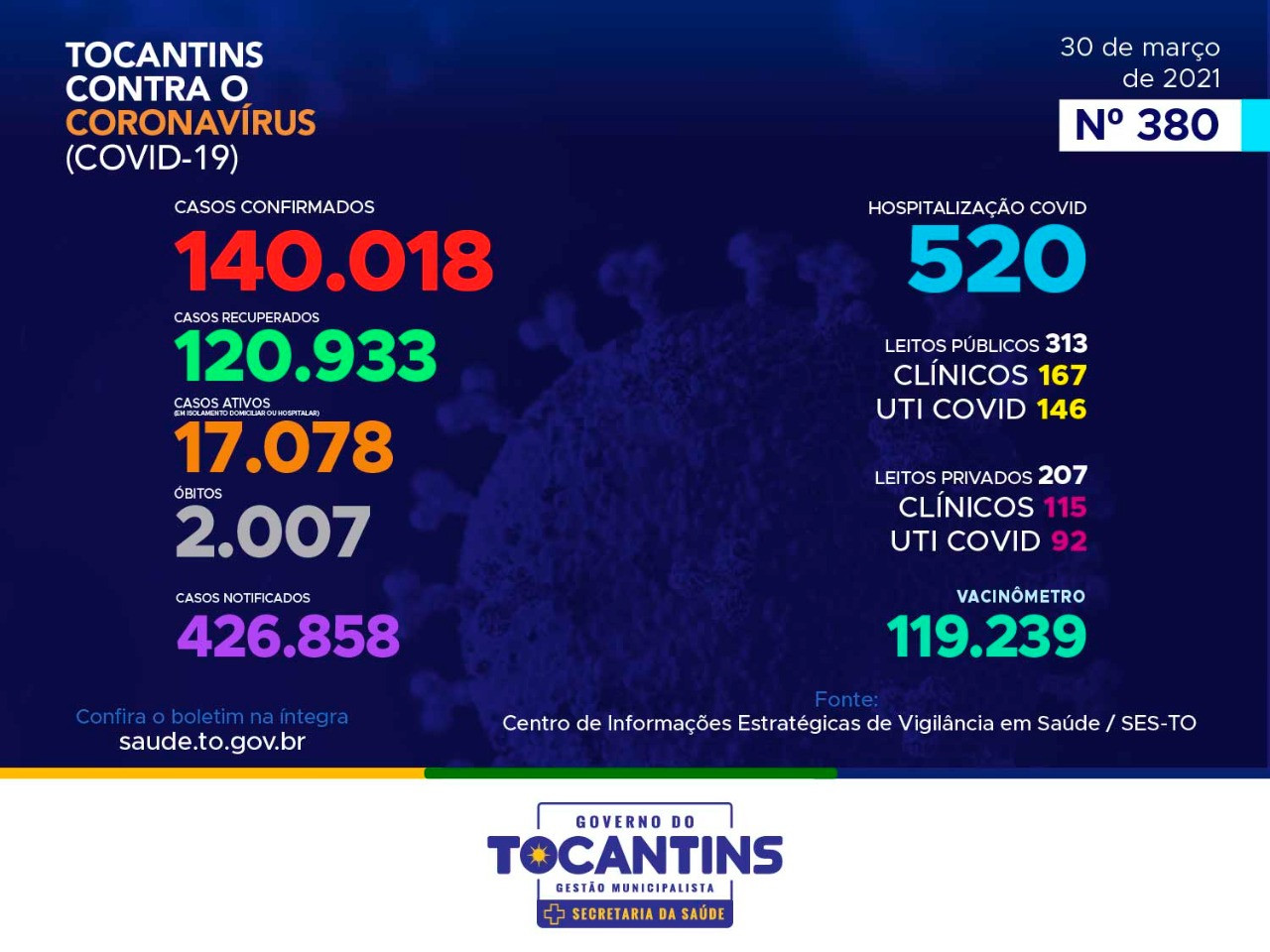 O Estado possui uma plataforma onde todos podem acompanhar os números da Covid-19 no Tocantins: http://integra.saude.to.gov.br/covid19