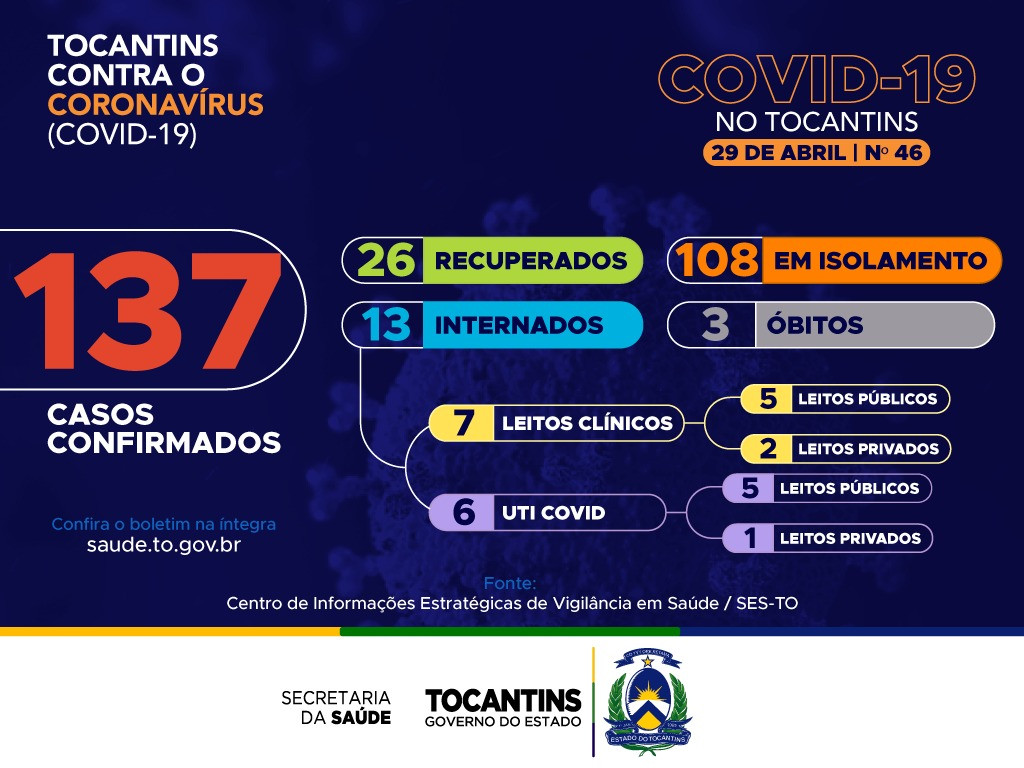 👉🏼 Atualmente, o Tocantins apresenta 137 casos ao total, destes, 03 pacientes foram a óbito, 26 pacientes estão recuperados, 108 pacientes estão em isolamento domiciliar e outros 13 pacientes estão internados: 10 na rede pública e 03 na rede privada.
