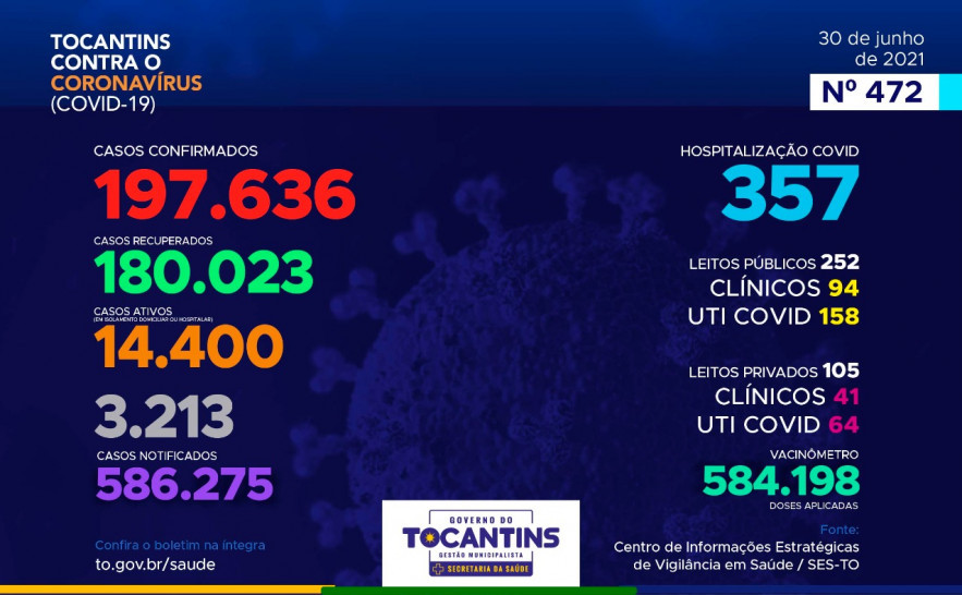 Atualmente, o Tocantins contabiliza 586.275 pessoas notificadas com a Covid-19 e acumula 197.636 casos confirmados. Destes, 180.023 estão recuperados, 14.400 pacientes seguem em isolamento domiciliar ou hospitalar e 3.213 foram a óbito.