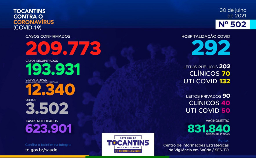 Atualmente, o Tocantins contabiliza 623.901 pessoas notificadas com a Covid-19 e acumula 209.773 casos confirmados. Destes, 193.931 estão recuperados, 12.340 pacientes seguem em isolamento domiciliar ou hospitalar e 3.502 foram a óbito.