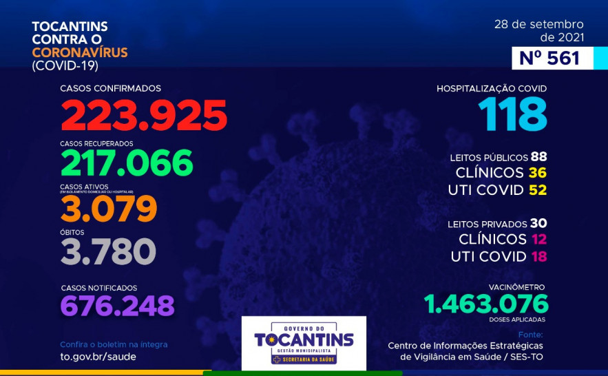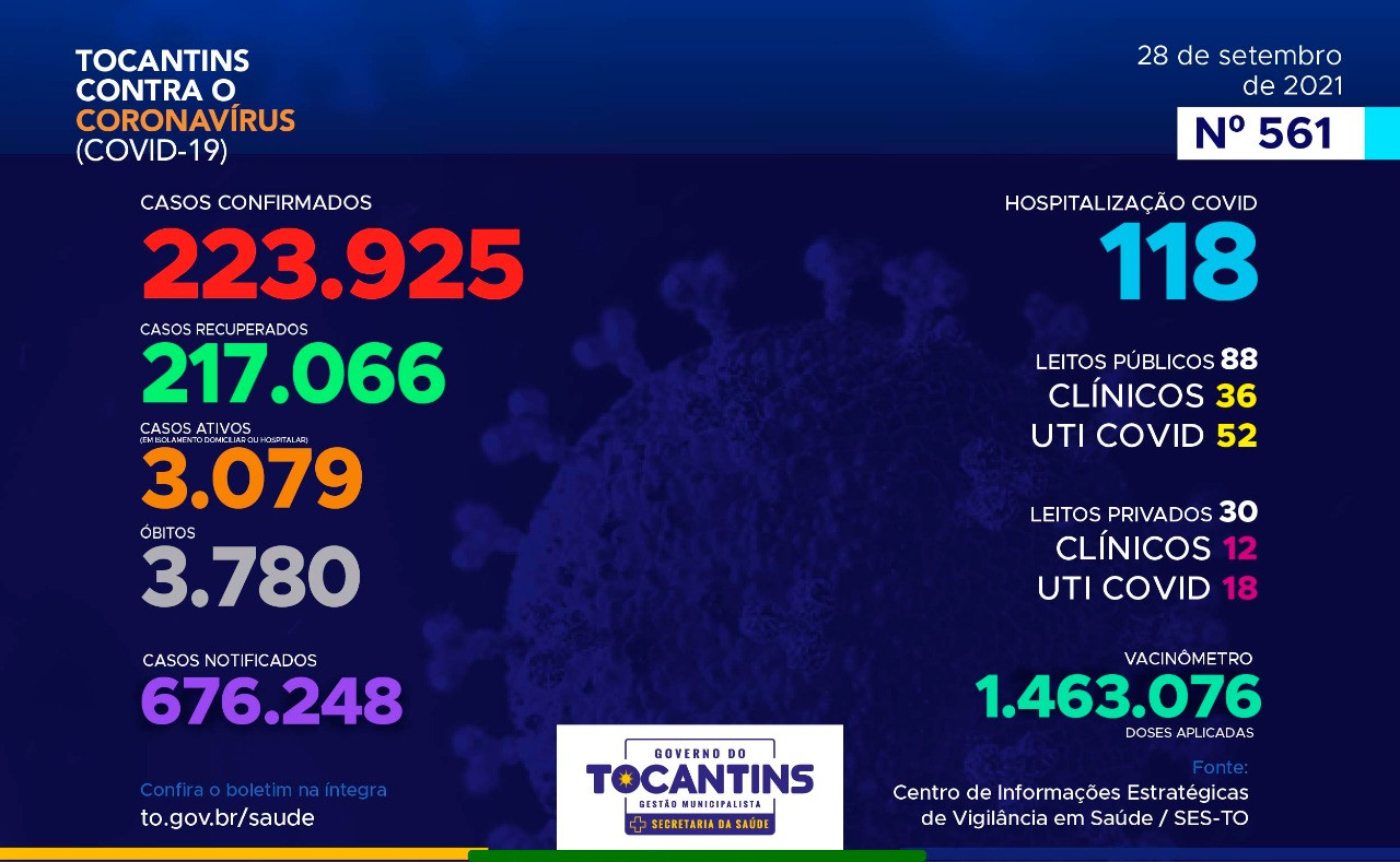 Atualmente, o Tocantins contabiliza 676.248 pessoas notificadas com a Covid-19 e acumula 223.925 casos confirmados. Destes, 217.066 estão recuperados, 3.079 pacientes seguem em isolamento domiciliar ou hospitalar e 3.780 foram a óbito.