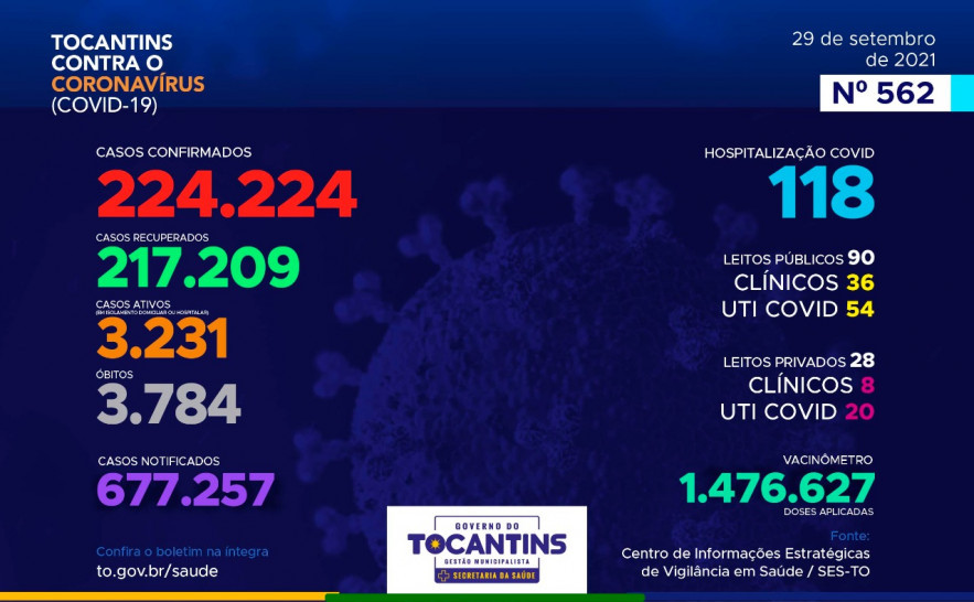 Atualmente, o Tocantins contabiliza 677.257 pessoas notificadas com a Covid-19 e acumula 224.224 casos confirmados. Destes, 217.209 estão recuperados, 3.231 pacientes seguem em isolamento domiciliar ou hospitalar e 3.784 foram a óbito.