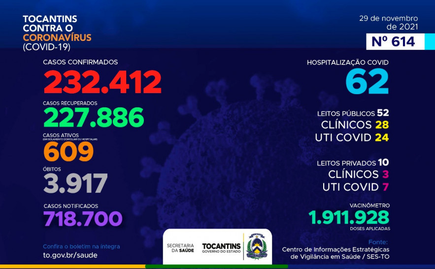 Atualmente, o Tocantins contabiliza 718.700 pessoas notificadas com a Covid-19 e acumula 232.412 casos confirmados. Destes, 227.886 estão recuperados, 609 pacientes seguem em isolamento domiciliar ou hospitalar e 3.917 foram a óbito.