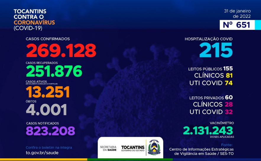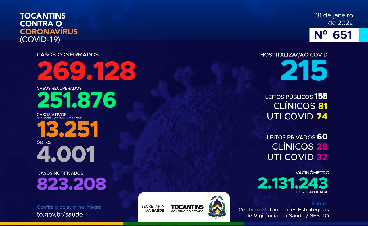 Atualmente, o Tocantins contabiliza 823.208 pessoas notificadas com a Covid-19 e acumula 269.128 casos confirmados. Destes 251.876 estão recuperados, 13.251 pacientes seguem em isolamento domiciliar ou hospitalar e 4.001 foram a óbito.