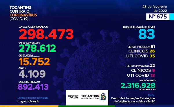 Atualmente, o Tocantins contabiliza 892.413 pessoas notificadas com a Covid-19 e acumula 298.473 casos confirmados. Destes 278.612 estão recuperados, 15.752 pacientes seguem em isolamento domiciliar ou hospitalar 4.109 foram a óbito.