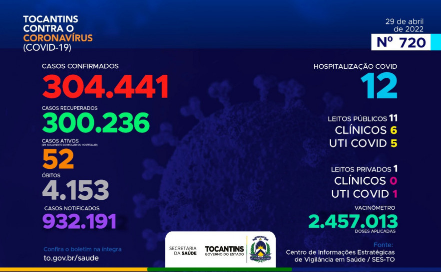 Atualmente, o Tocantins contabiliza 932.191 pessoas notificadas com a Covid-19 e acumula 304.441 casos confirmados. Destes 300.236 estão recuperados, 52 pacientes seguem em isolamento domiciliar ou hospitalar e 4.153 foram a óbito.