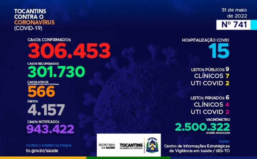 Atualmente, o Tocantins contabiliza 943.422 pessoas notificadas com a Covid-19 e acumula 306.453 casos confirmados. Destes 301.730 estão recuperados, 566 pacientes seguem em isolamento domiciliar ou hospitalar e 4.157 foram a óbito.