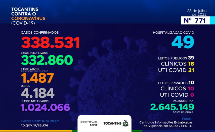 Atualmente, o Tocantins contabiliza 1.024.066 pessoas notificadas com a Covid-19 e acumula 338.531 casos confirmados. Destes 332.860 estão recuperados, 1.487 pacientes seguem em isolamento domiciliar ou hospitalar e 4.184 foram a óbito.