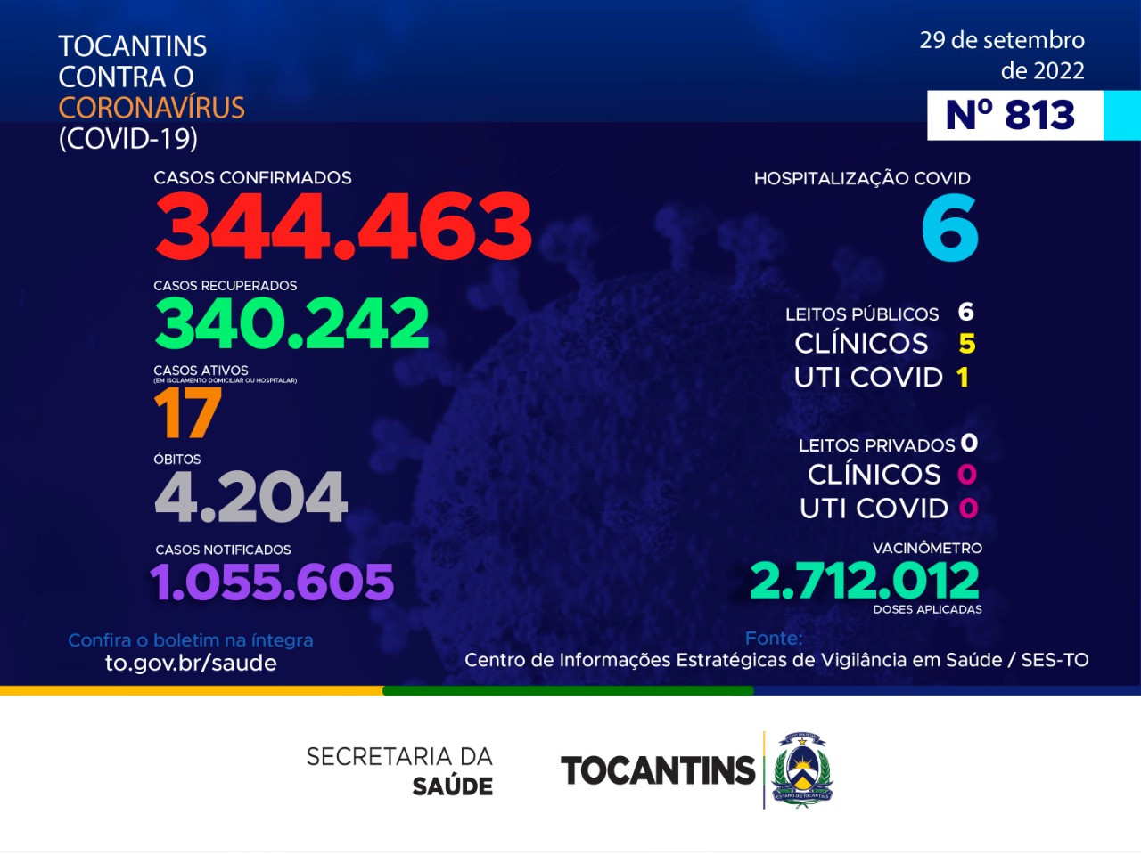 Atualmente, o Tocantins contabiliza 1.055.605 pessoas notificadas com a Covid-19 acumula 344.463 casos confirmados. Destes 340.242 estão recuperados, 17 pacientes seguem em isolamento domiciliar ou hospitalar e 4.204 foram a óbito.