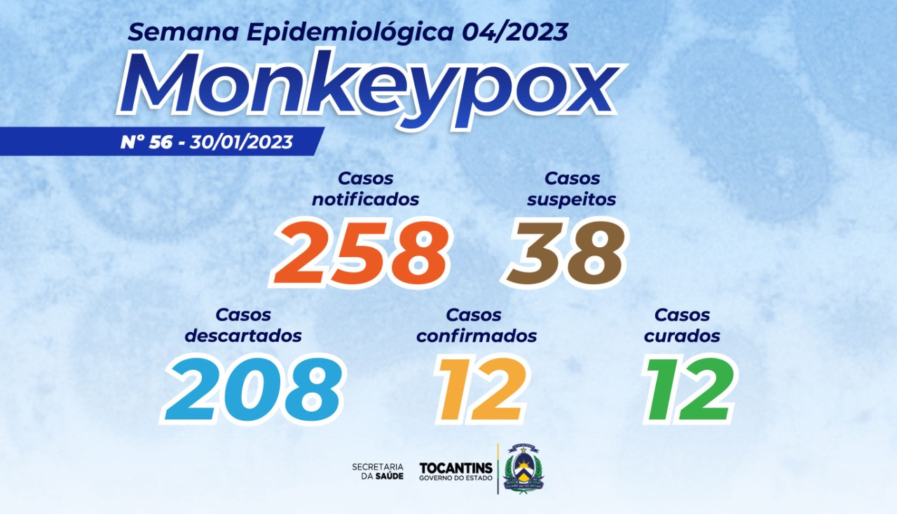 Nesta segunda-feira, 30, a Secretaria de Estado da Saúde (SES-TO) divulgou a atualização dos dados da Monkeypox, no Tocantins. Abaixo, levantamento do Centro de Informações Estratégicas de Vigilância em Saúde (CIEVS-TO), até 28 de janeiro de 2023:
