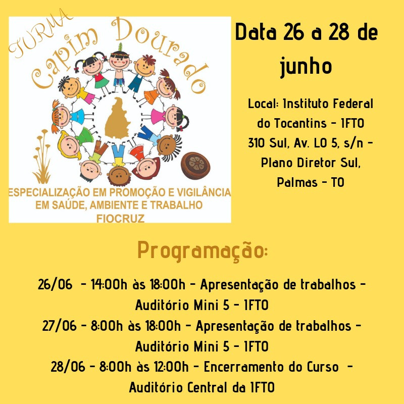 Os 57 concluintes da turma de pós-graduação em Promoção e Vigilância em Saúde, Ambiente e Trabalho apresentarão nos dias 26 a 28 de junho, os Trabalhos de Conclusão de Curso (TCC), em forma de projetos de intervenções coletivas, desenvolvidos ao longo do curso e é um dos pré-requisitos para a certificação como especialista. As apresentações acontecerão no mini auditório do Instituto Federal do Tocantins (IFTO), em Palmas.