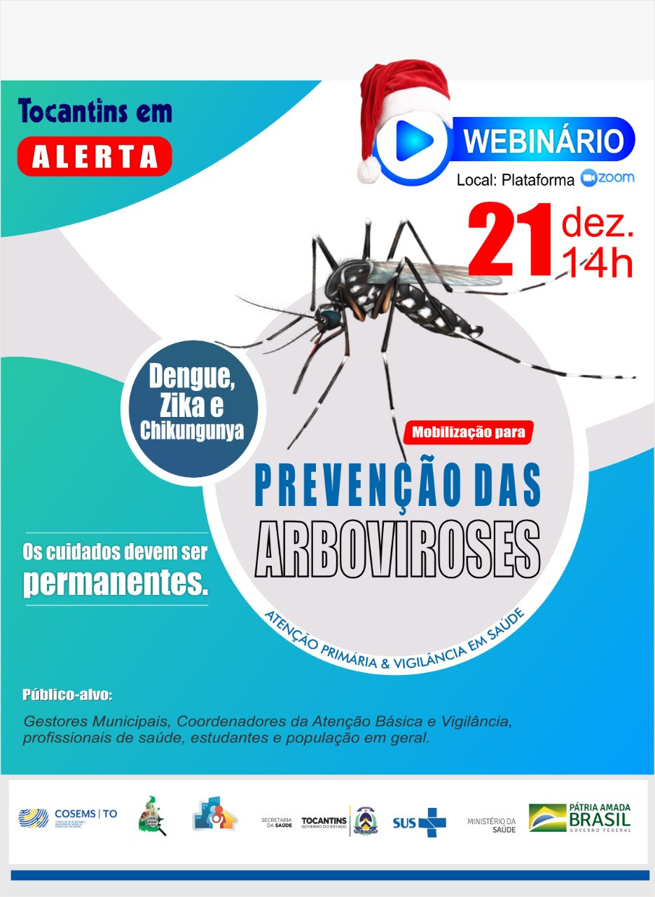Para promover a divulgação e esclarecimento sobre as informações da Nota Técnica a Diretoria de Atenção Primária e a Superintendência de Vigilância em Saúde da SES-TO, em parceria com o Conselho de Secretarias Municipais de Saúde do Tocantins (COSEMS TO), realizarão um Webinário com o tema ‘Mobilização para prevenção das arboviroses (Dengue, Zika e Chikungunya)’.