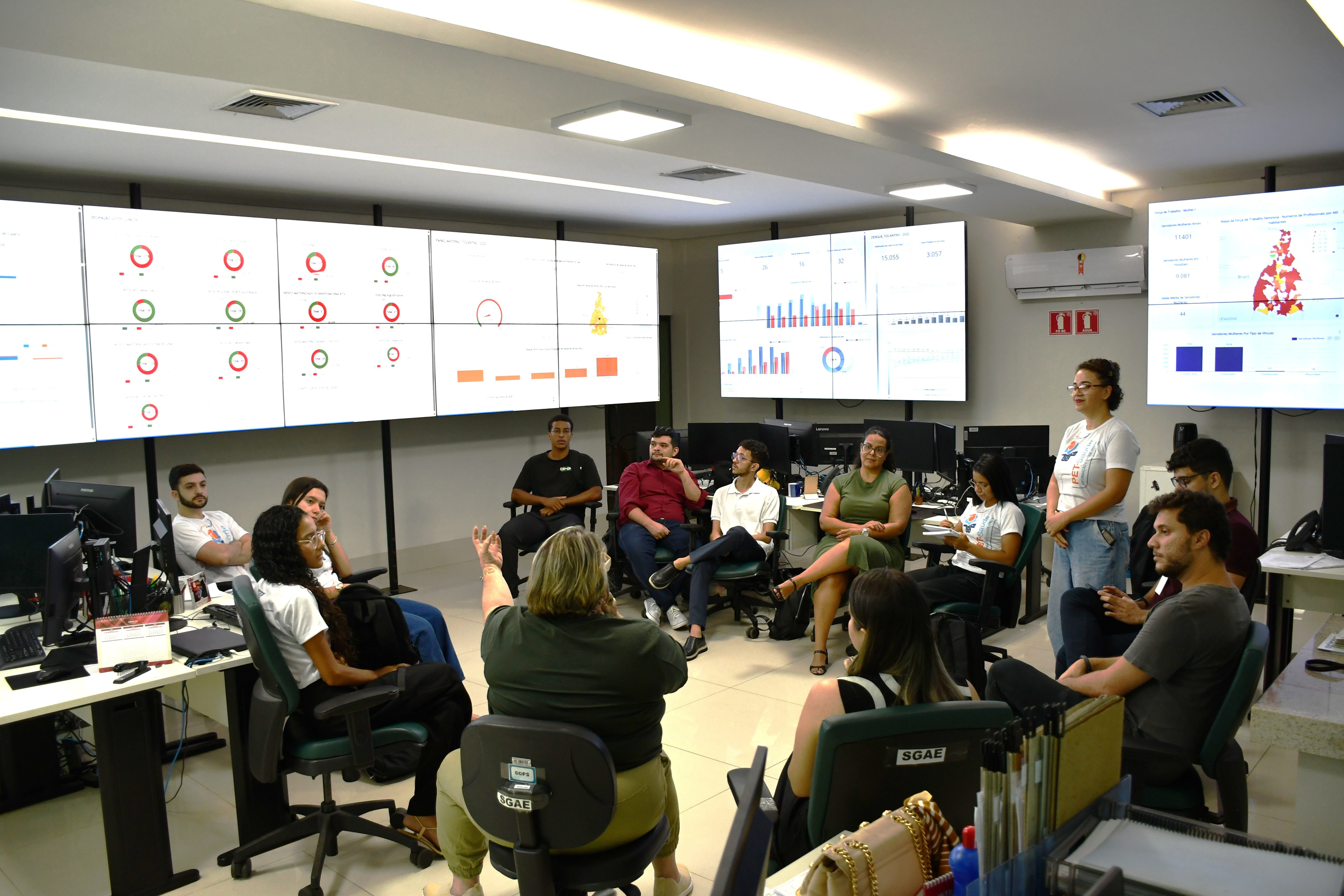 Segundo a enfermeira da SGPES/SES-TO, Hortência Farias, “estamos apresentando hoje aos alunos visitantes, os serviços da SES-TO. O PET-SAÚDE é muito importante porque incentiva à produção de conhecimento e a aplicação prática das políticas de saúde. Possui foco em saúde digital, equidade de gênero, raça e etnia”.