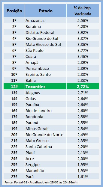 O Estado do Tocantins encerra a semana como o 12º ente da Federação, em imunização de pessoas contra a Covid-19, conforme dados do Consórcio de Veículos de Imprensa do Brasil. Até esta sexta-feira, 26, 51.802 doses da 1ª e 2ª fase já foram aplicadas e a Secretaria Estadual da Saúde (SES) segue orientando a vacinação e a alimentação do Sistema de Informação do Programa Nacional de Imunização.