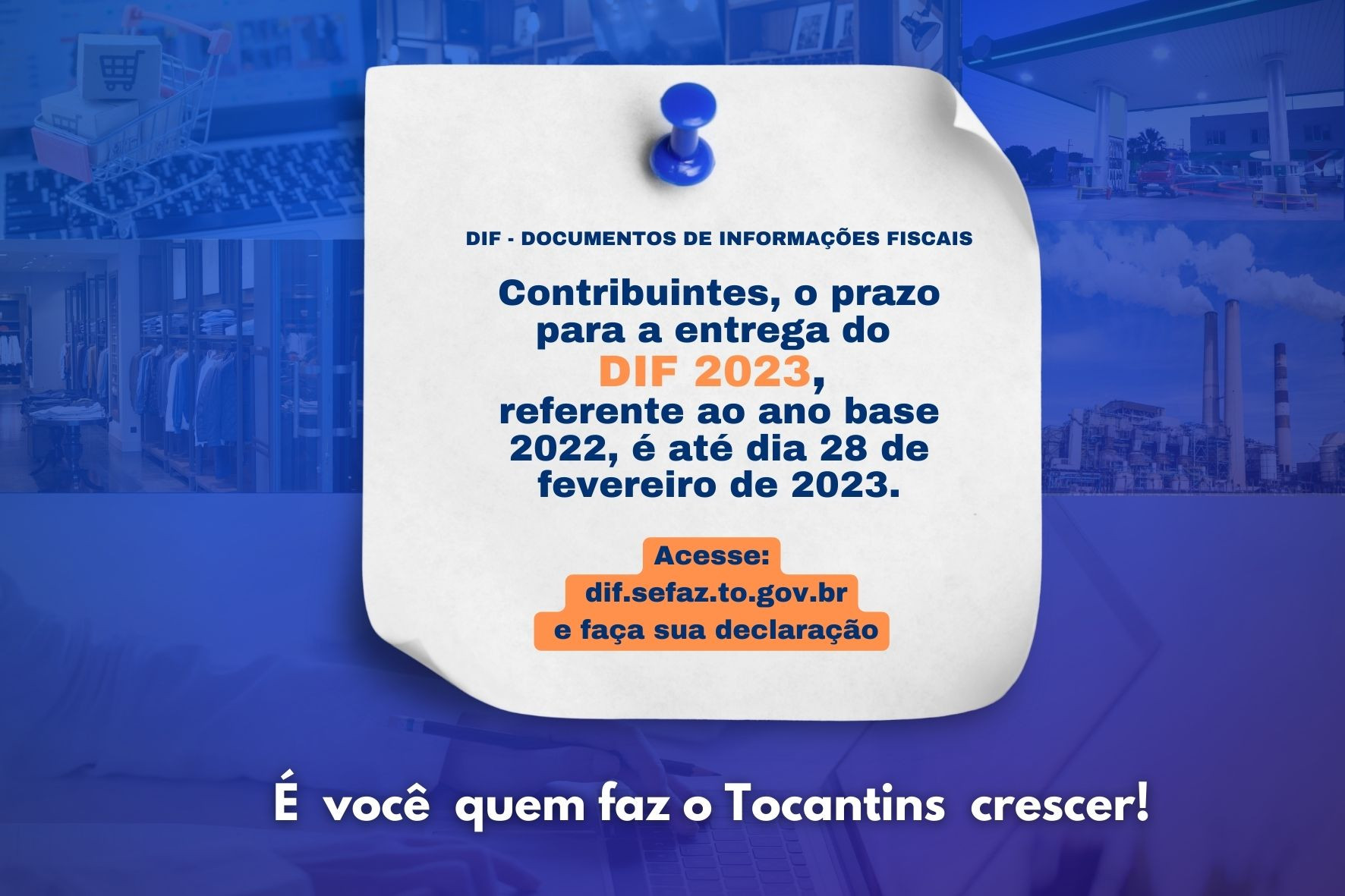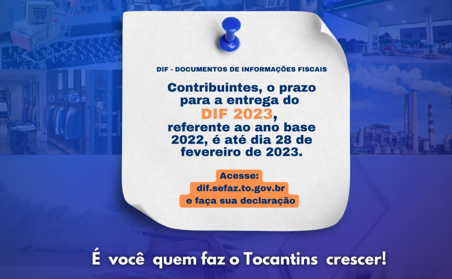 A partir de amanhã, 1º de fevereiro, os inscritos no Cadastro de Contribuintes do Estado do Tocantins (CCI-TO) já podem fazer a entrega do Documento de Informações Fiscais (DIF), ano base 2022. A apresentação das informações deve ser feita somente via internet, até dia 28 de fevereiro. Acesse aqui , e preencha o formulário com as informações solicitadas.