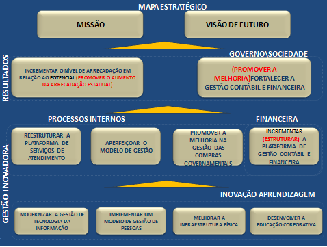 Pela nova redação aprovada a Missão da a ser “arrecadar e realizar a gestão financeira e contábil do estado, promovendo o equilíbrio fiscal, garantindo recursos para as políticas públicas”, e trabalhar com Visão de “ser uma instituição reconhecida nacionalmente pela excelência em arrecadação e gestão financeira e contábil”. Além disso, foram ajustados os objetivos e indicadores para efetuar melhorias, correções e alinhamentos do negócio da Sefaz, visando o alcance dos resultados definidos.