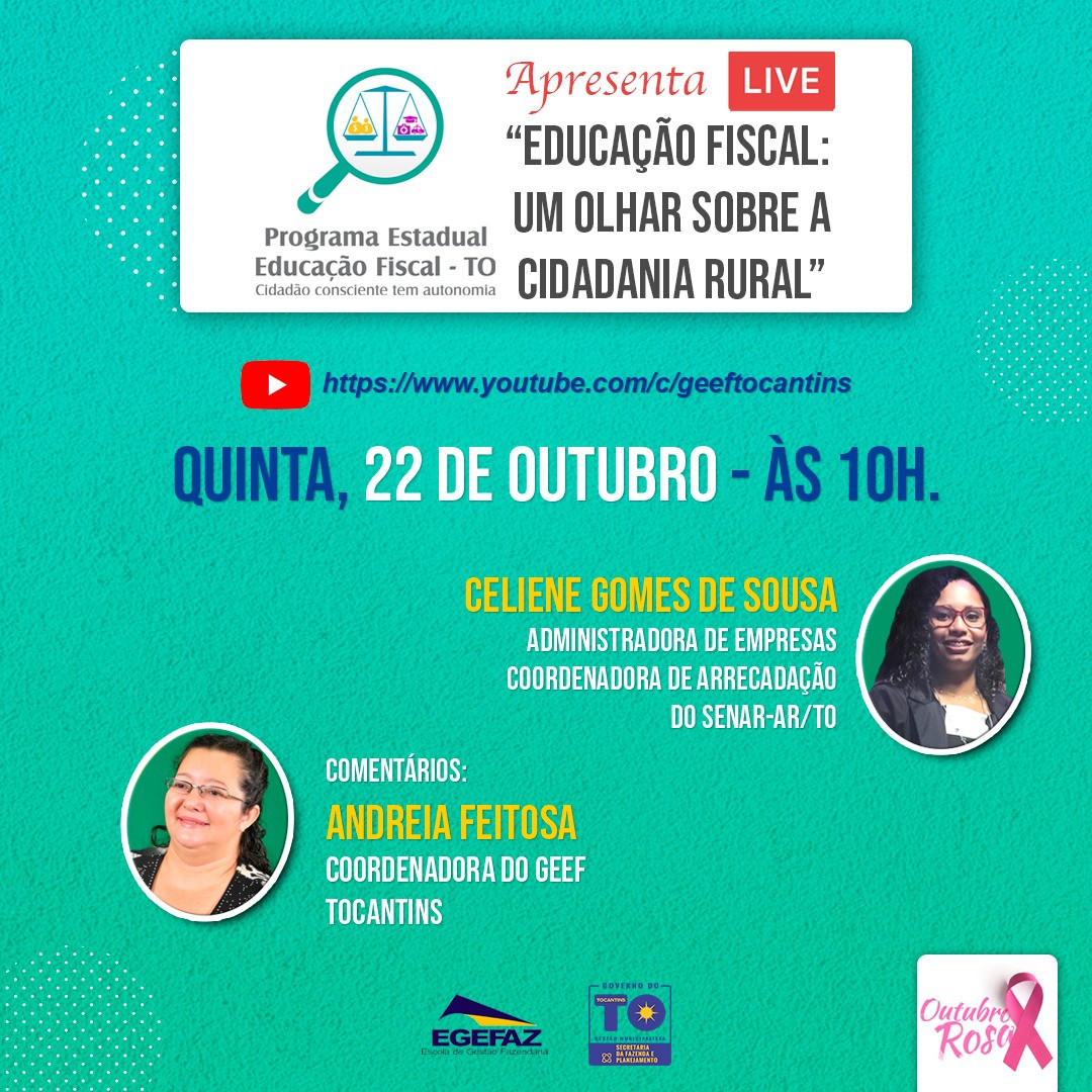 Para orientar e informar homens e mulheres do campo sobre direitos e deveres, com foco na legislação previdenciária e tributária, o Grupo Estadual de Educação Fiscal do Tocantins (Geef-TO) apresenta no próximo dia 22 de Outubro, às 10h, a live Educação Fiscal: Um Olhar sobre a Cidadania Rural, com transmissão pelo canal do Geef no Youube.