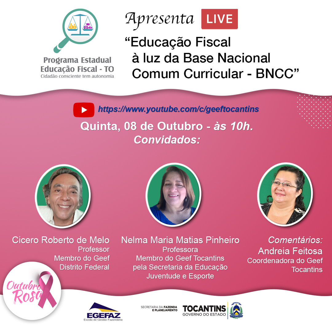 A live terá como painelistas o professor de Educação Básica e Superior, especialista em Educação Fiscal pela (Esaf), membro do Grupo de Educação Fiscal do Distrito Federal, representante da Secretaria de Educação do DF e da Assessoria de Educação Fiscal da Secretaria de Estado de Economia do DF, Cícero Roberto de Melo e a professora da Educação Básica, especialista em Administração e Gestão Escolar e Gestão Educacional e Metodologias, e membro do Grupo Estadual de Educação Fiscal – GEEF/TO pela Secretaria da Educação, Juventude e Esportes, Nelma Maria Matias Pinheiro.