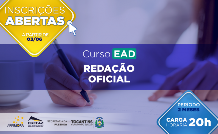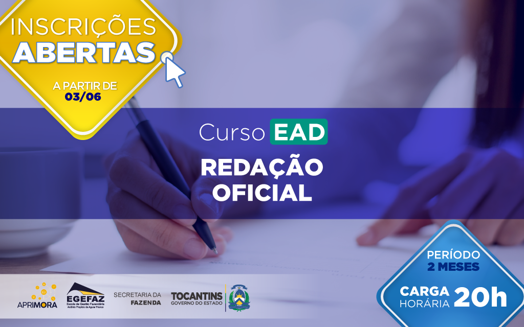 A Escola de Gestão Fazendária Antônio Propício de Aguiar Franco (Egefaz) abriu na manhã desta sexta, dia 3, inscrições para o curso Redação Oficial em seu ambiente virtual de aprendizagem. Na modalidade Educação a distância, as aulas ocorrerão no período de 08 de junho a 07 de agosto de 2022, com carga horária de 20 horas. Para realizar sua inscrição acesse o portal da Egefaz.