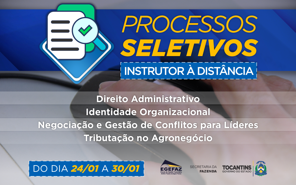 A Secretaria da Fazenda, por meio da Escola de Gestão Fazendária (Egefaz), abre processo seletivo de instrutores para quatro cursos que serão oferecidos na modalidade à distância (EaD). O Edital foi publicado no Diário Oficial do Estado nº 6014, do dia 24 de janeiro.