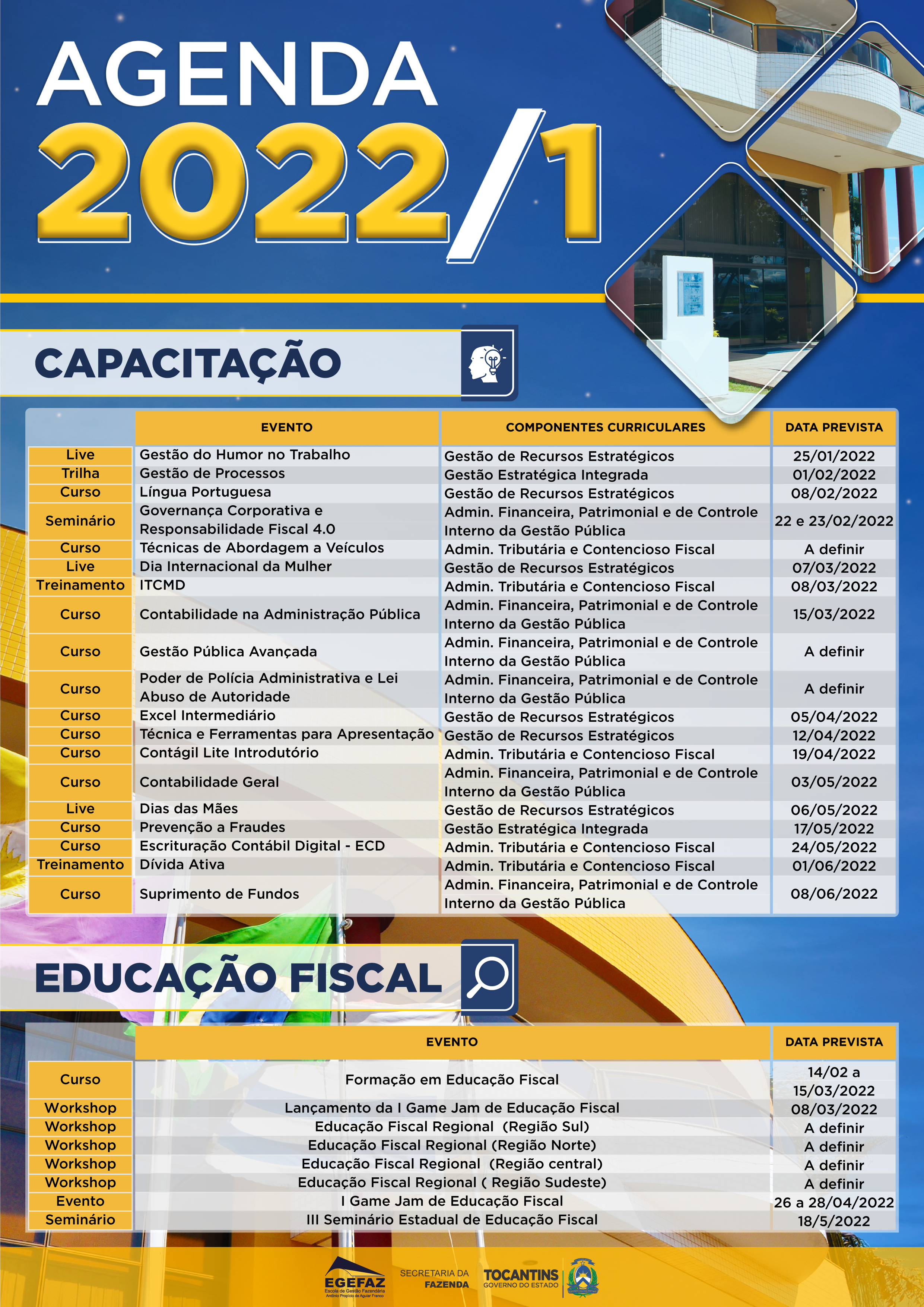 Escola de Gestão Fazendária Antônio Propício de Aguiar Franco disponibilizou em seu ambiente virtual o calendário de cursos e eventos para o primeiro semestre do exercício de 2022. Na programação contém seminários, palestras, cursos, treinamentos, trilhas, workshops e lives que abordam diversos temas inerentes às atividades da Secretaria da Fazenda, comportamentos e bem-estar humanos. A ideia é que o servidor fazendário já se programe para as atividades que lhe interessam.