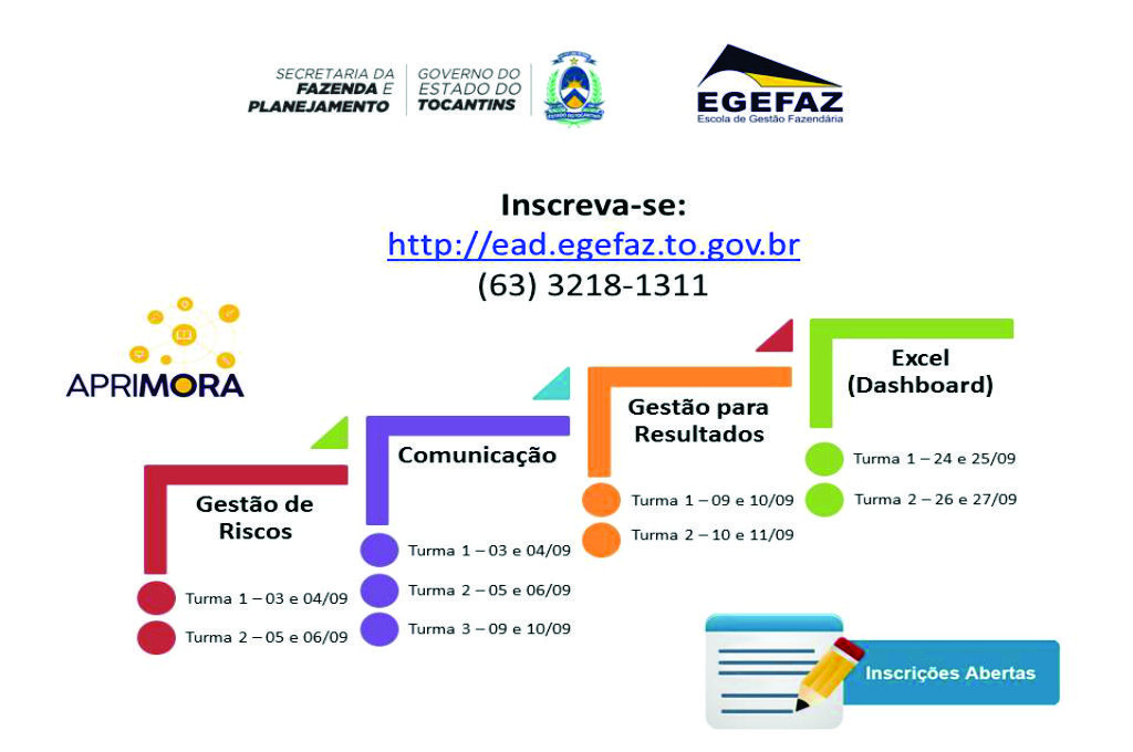 A Escola de Gestão Fazendária Antônio Propício de Aguiar Franco (Egefaz) está com inscrições abertas para mais quatro cursos que fazem parte do Aprimora, o programa de capacitação dos servidores da Secretaria da Fazenda e Planejamento (Sefaz), que tem como objetivo de elevar a satisfação do servidor por meio de qualificação profissional e pessoal e, consequentemente, contribuir com a boa qualidade do desempenho de suas funções e evolução dos serviços prestados.