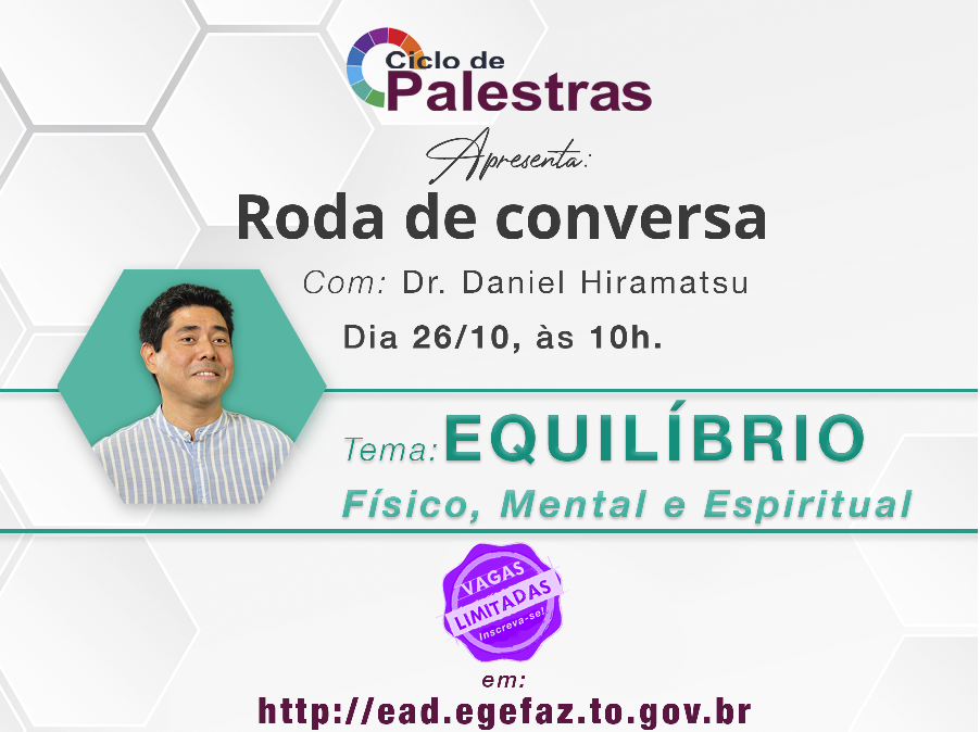A Escola de Gestão Fazendária (Egefaz) está com inscrições abertas na plataforma digital para a roda de conversa sobre o Equilíbrio físico, mental e espiritual que acontecerá no próximo dia 26 de Outubro, às 10h, no mesmo ambiente das inscrições. A conversa será com o médico Daniel Martins Hiramatsu, que já apresentou o assunto em palestra virtual realizada pela Egefaz.