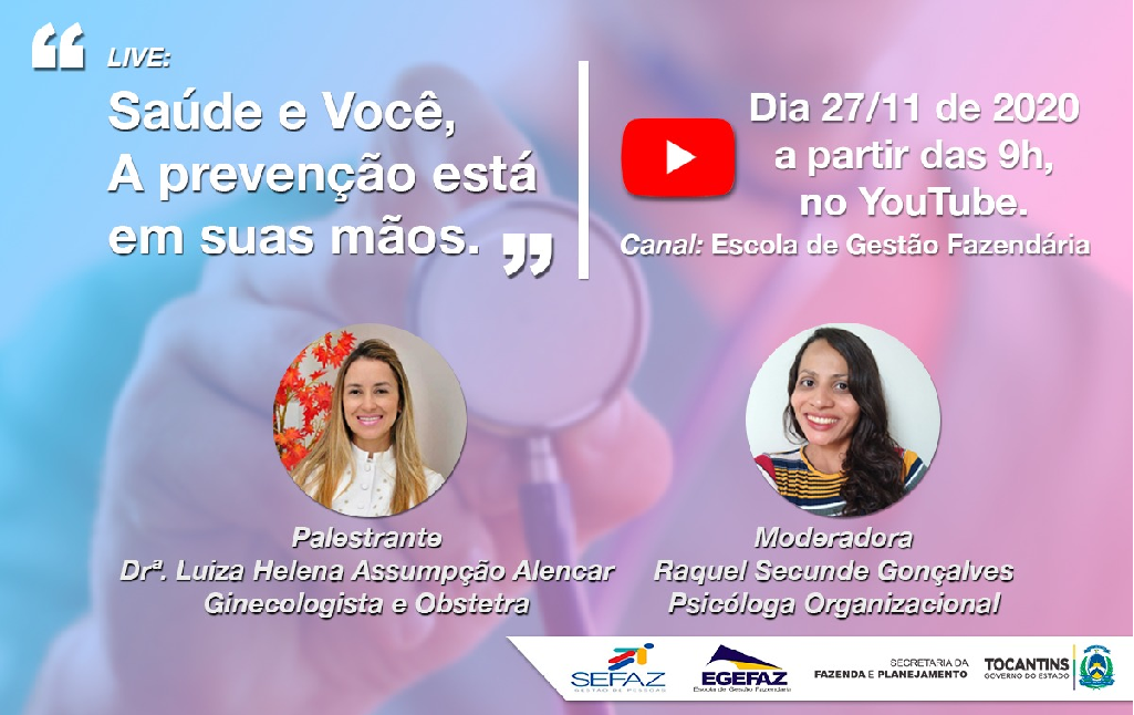 A Gerência de Gestão de Pessoas, em parceria com a Escola de Gestão Fazendária Antônio Propício de Aguiar Franco (Egefaz), realizará nesta sexta-feira, dia 27 de Novembro, às 9 horas, uma live com o tema: Saúde e Você - a prevenção está em suas mãos. O objetivo é sensibilizar os servidores sobre a importância da prevenção ao câncer de mama. A transmissão pelo canal da Egefaz no Youtube.