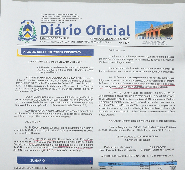 O Governo do Estado fez o primeiro contingenciamento no orçamento do exercício de 2017, em razão da frustração de receitas apuradas até o primeiro bimestre deste ano. O Decreto nº 5.612 foi publicado, ontem, 30 de março de 2017, define o retardamento da execução da Lei Orçamentária no montante de R$ 61.609.203,00, sendo que as Secretarias da Fazenda e a de Planejamento estarão encarregadas de estabelecer quais despesas deverão ser suspensas.
