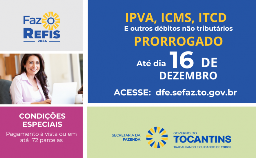 Com o Refis, por meio de suporte da Secretaria de Estado da Fazenda (Sefaz), os contribuintes tocantinenses em dívida com o Imposto sobre Circulação de Mercadorias e Serviços (ICMS), Imposto sobre Propriedades de Veículos Automotores (IPVA), Imposto sobre Transmissão Causa Mortis e Doação (ITCD) e créditos não tributários terão a chance de quitar pendências com a receita estadual.