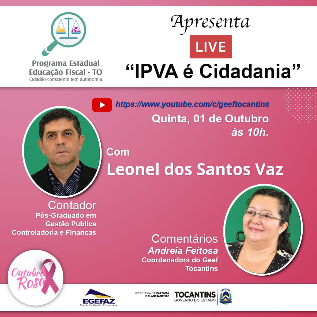 O evento faz parte das ações do Geef, que tem por missão cuidar da Educação Fiscal no Estado do Tocantins, sendo esta entendida como o conjunto de ações que contribuam para a formação da cultura educacional voltada ao exercício da cidadania, na perspectiva de constituir uma sociedade participativa e conhecedora de seus direitos e deveres, objetivando ao aperfeiçoamento dos instrumentos de controle social e fiscal no Estado. “Então massificar conhecimentos sobre os impostos, como IPVA, mostrando sua importância para o desenvolvimento do Estado, é uma forma de conscientizar o cidadão sobre sua responsabilidade pessoal, destacando também a seu papel de contribuinte fiscal da aplicação dos recursos arrecadado”, explica a coordenadora do Geef, Andreia Feitosa, que também será comentarista na live “IPVA é cidadania”.