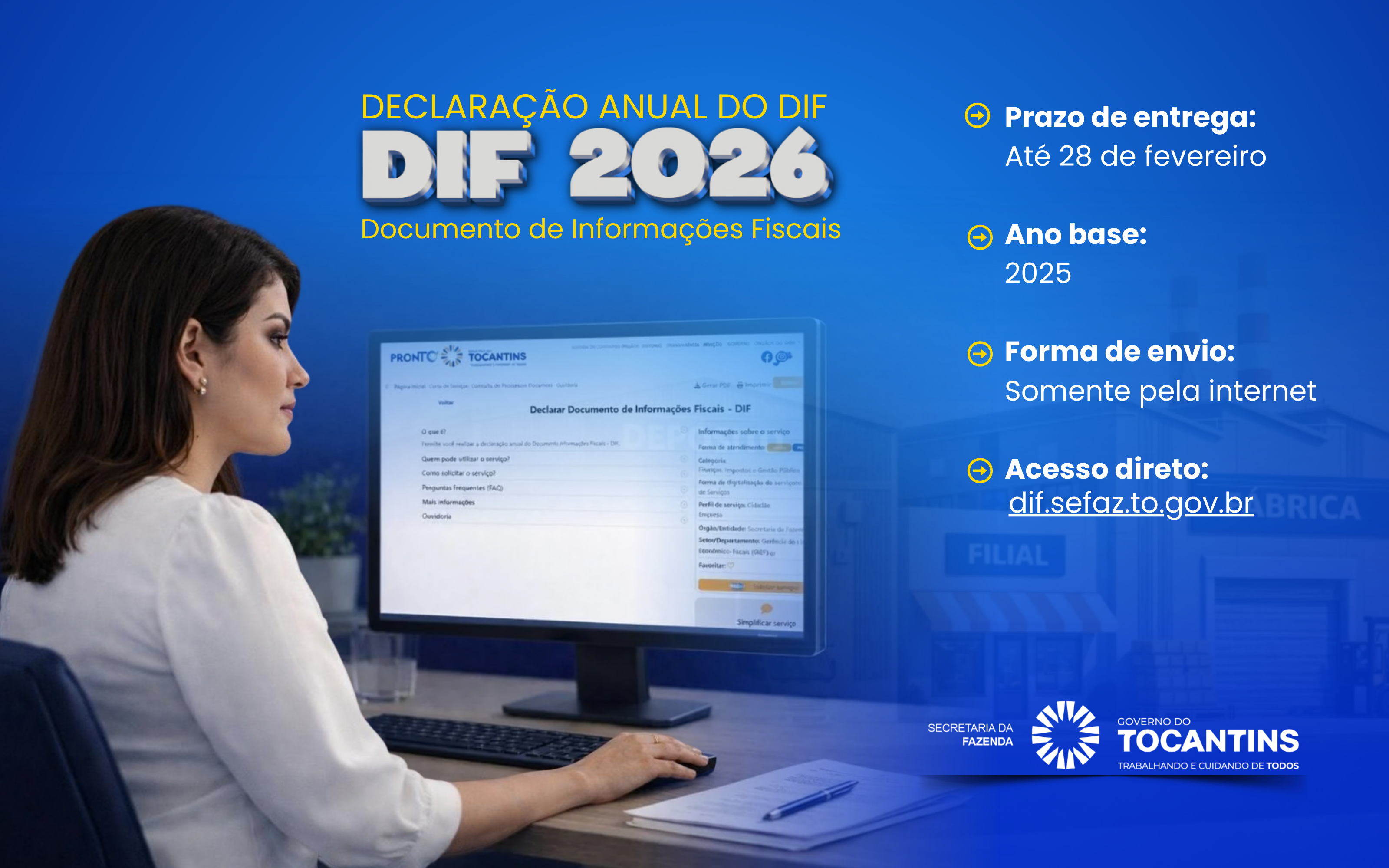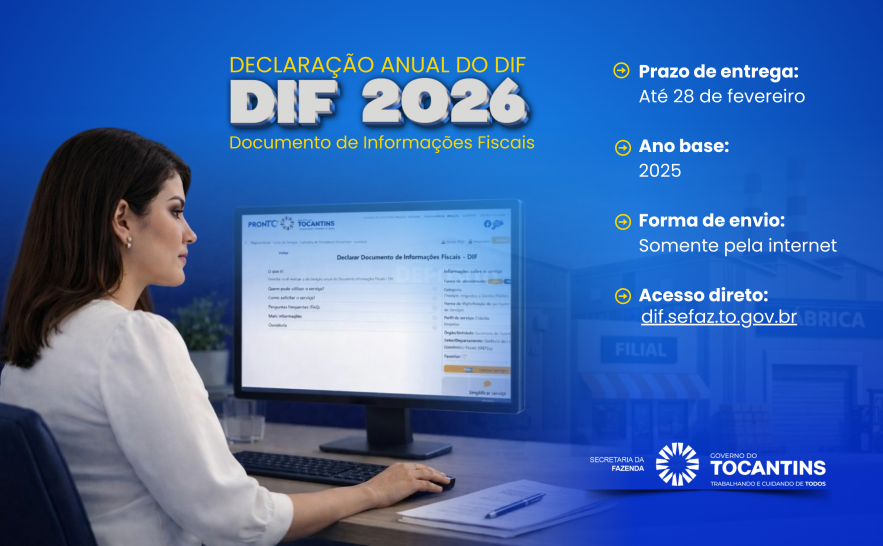 A Secretaria da Fazenda do Tocantins (Sefaz-TO) informa que já está disponível para download, o Programa DIF Eletrônico, versão 2026. A entrega do Documento de Informações Fiscais (DIF), referente ao ano-base de 2025, deve ser efetuada exclusivamente pela internet, por meio do endereço eletrônico dif.sefaz.to.gov.br, até o dia 28 de fevereiro.