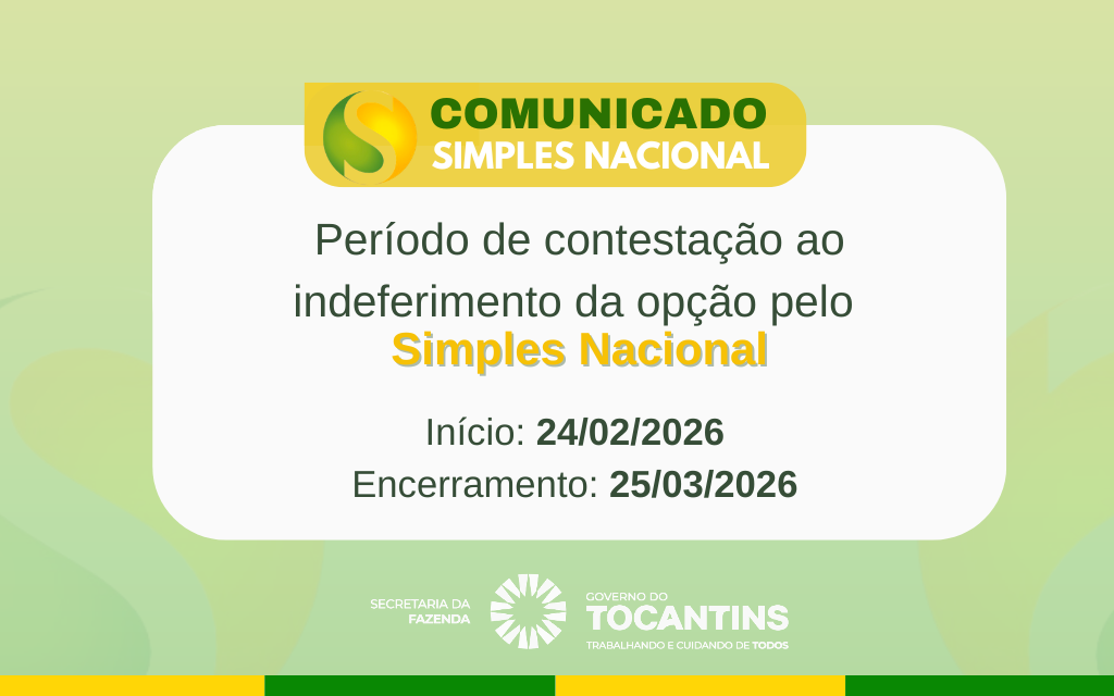 A Secretaria de Estado da Fazenda do Tocantins, comunica às ME/EPP, cujo pedido de formalização de opção tenha sido indeferido por esta Administração Tributária, que o prazo para apresentar a contestação ao indeferimento da Opção pelo Simples Nacional – Janeiro/2026 se inicia em 24/02/2026 e se encerra em 25/03/2026, conforme previsto no Edital de Notificação n.º 001/2026, não sendo apreciados os pedidos apresentados fora desse prazo. Clique aqui para acessar o edital, Doe 7.002, página 28.