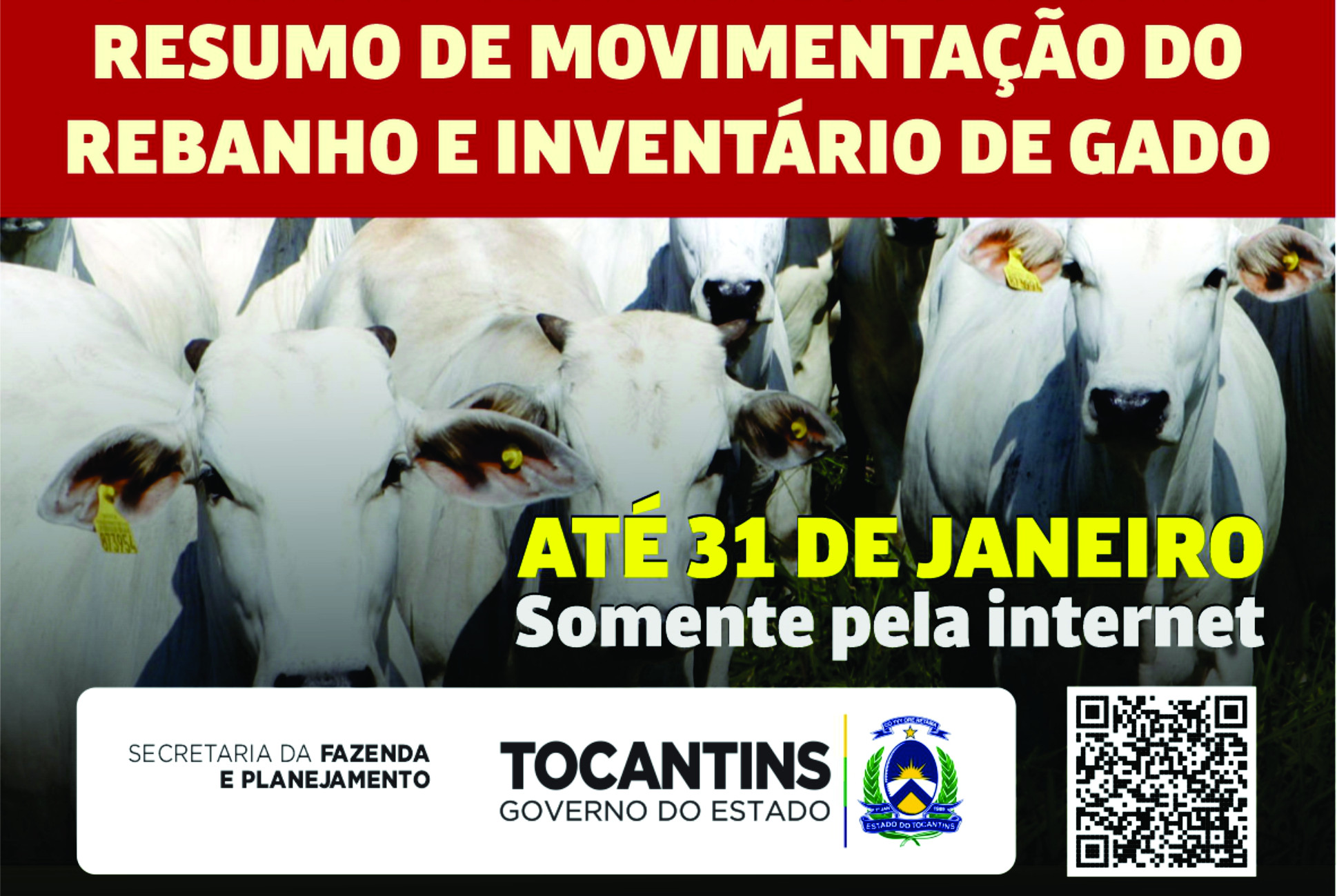 No próximo dia 31 termina o prazo para os produtores agropecuários do Estado do Tocantins, inscritos no Cadastro de Contribuintes do ICMS (CCI), entregarem a Declaração do Resumo da Movimentação do Rebanho e Inventário de Gado, exercício 2019. A declaração é anual, obrigatória e feita somente pela internet.