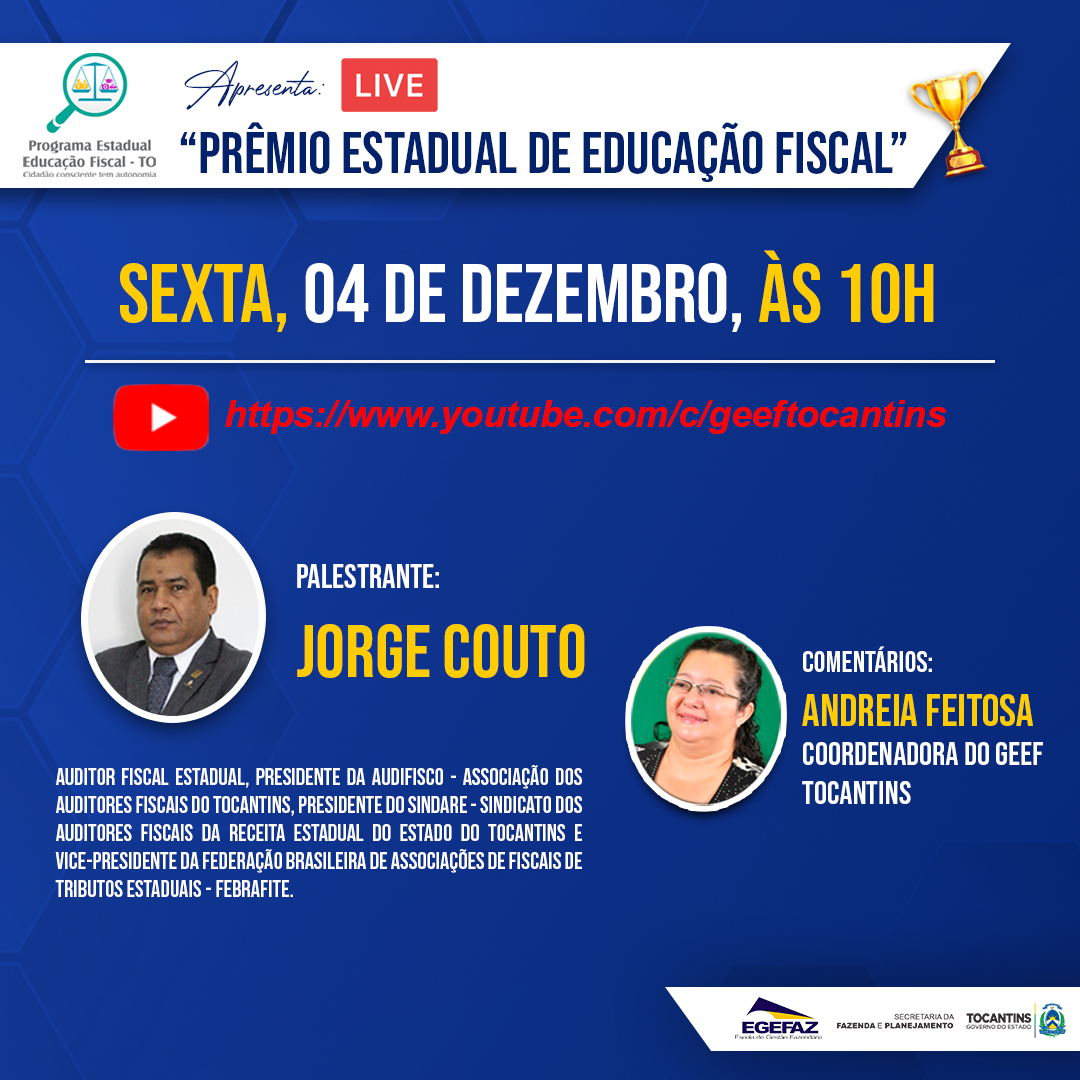 O Evento tem como convidado o Auditor Fiscal Jorge Couto e será mediado pela Coordenadora do Grupo Estadual de Educação Fiscal, Andreia Feitosa. Na Live, o Auditor irá falar sobre a criação do Prêmio Estadual de Educação Fiscal no Tocantins, bem como da importância dos Sindicatos em atuarem como parceiros do Grupo Estadual de Educação Fiscal, com o fim de expandir a disseminação da cultura fiscal no Estado. Atualmente, Couto é Presidente da Audifisco – Associação dos Auditores Fiscais do Estado do Tocantins, Presidente do Sindare – Sindicato dos Auditores Fiscais da Receita Estadual do Tocantins e Vice-Presidente da Federação Brasileira de Associações de Fiscais e Tributos Estaduais – Febrafite, além de Presidente do Conselho Fiscal do Instituto de Gestão Previdenciária do Estado do Tocantins – IGREPEV.
