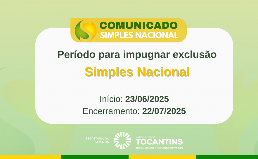IMPORTANTE: O Edital acima mencionado foi publicado no Diário Oficial do Estado – DOE n.º 6.837, de 16 de junho de 2025, páginas 30 e 31. O prazo para regularizar e impugnar será: De 23/06/2025 a 22/07/2025. Para mais informações entrar em contato com a Gerência de Fiscalização de Estabelecimentos - GFE da Secretaria da Fazenda, no telefone: (63) 3027-2022 ou com as Agências de Atendimentos de jurisdição