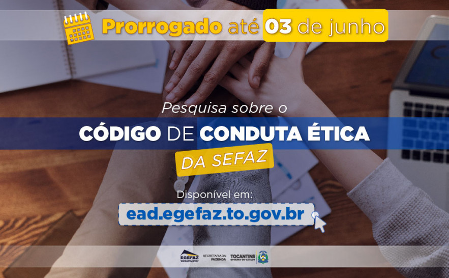 A Secretaria de Fazenda do Estado do Tocantins (SefazTO) prorrogou até a próxima sexta-feira, dia 3 pesquisa que está realizando sobre o novo Código de Conduta Ética da Sefaz (CCE-Sefaz. A ideia é colher junto aos servidores informações que tornem o documento compatível à realidade da pasta preservando os conceitos filosóficos e princípios legais que gerem condutas éticas em geral.