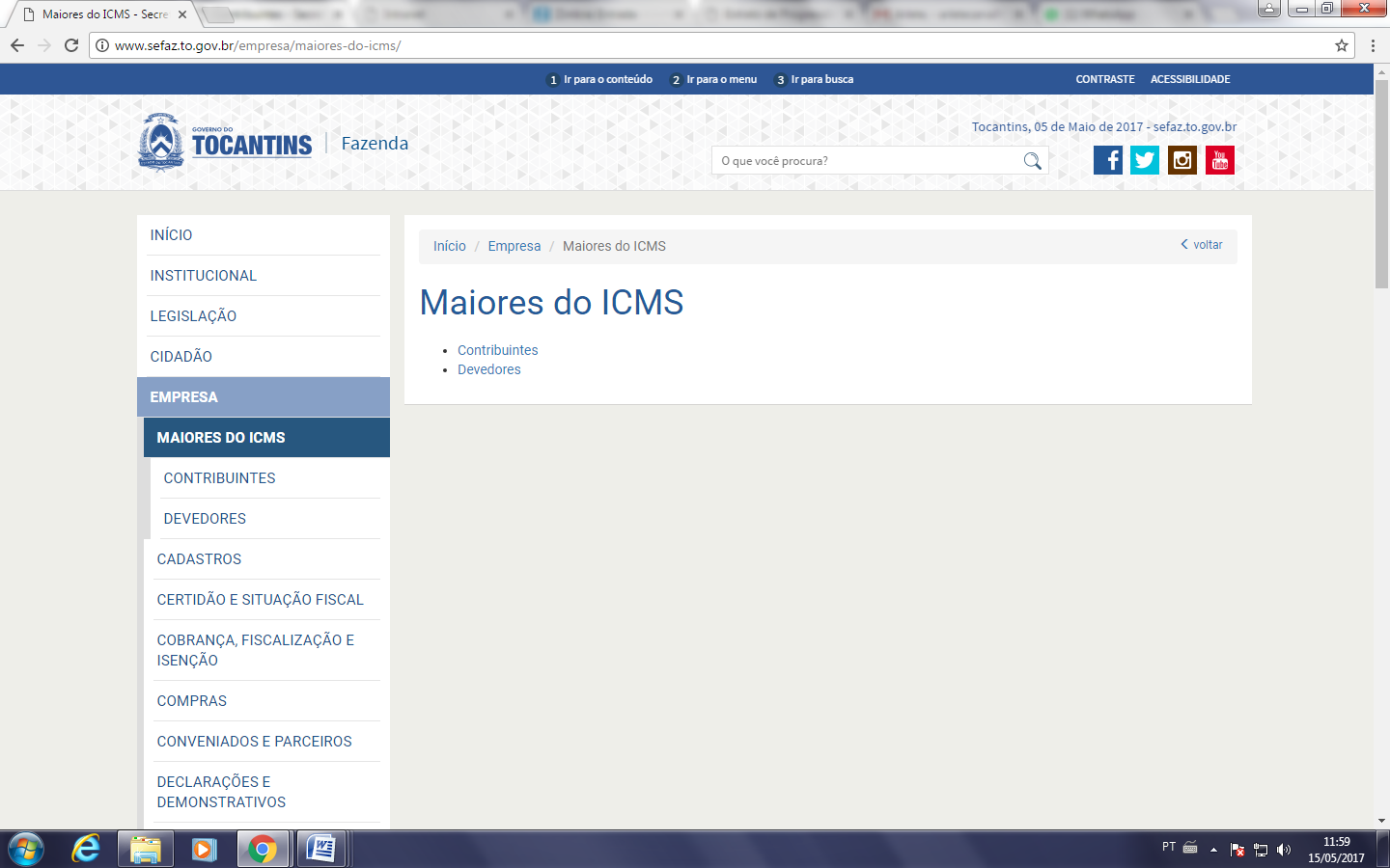 Já a relação das 50 pessoas jurídicas que possuem os maiores débitos do ICMS, inscritos em dívida ativa, na condição de devedor principal, co-responsável ou solidário, pode ser acessada também por meio do link “Empresas/Maiores do ICMS” (http://www.sefaz.to.gov.br/empresa/maiores-do-icms/devedores/).
