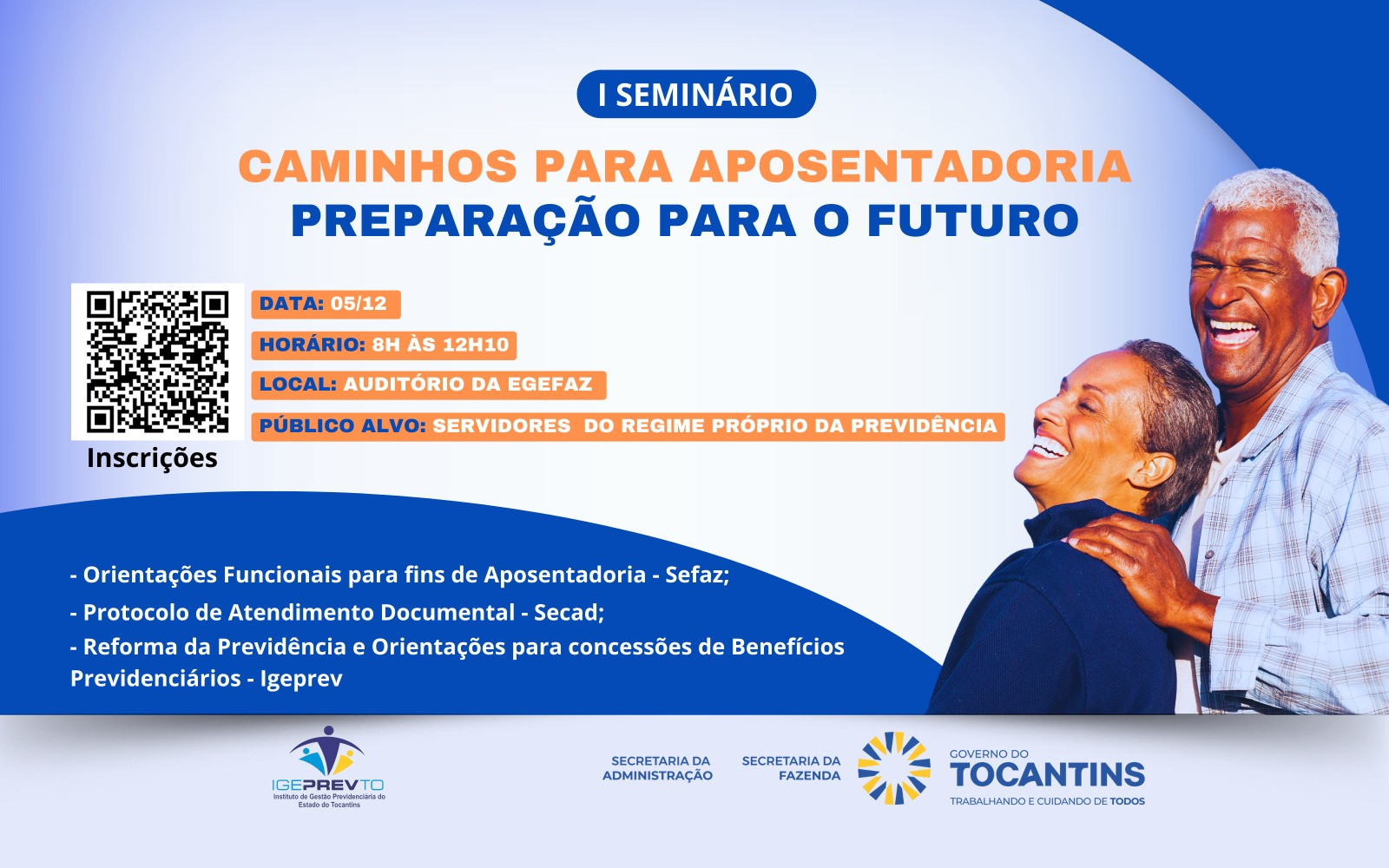 A Secretaria da Fazenda do Tocantins (Sefaz), em parceria com o Instituto de Gestão Previdenciária do Tocantins (Igeprev) e a Secretaria da Administração (Secad), realiza nesta quinta-feira, 5 o I Seminário "Caminhos para Aposentadoria: Preparação para o Futuro". O evento, que será transmitido ao vivo pelo canal da Egefaz no YouTube, tem como objetivo principal esclarecer dúvidas sobre os procedimentos para aposentadoria e as novas regras da Lei da Previdência.