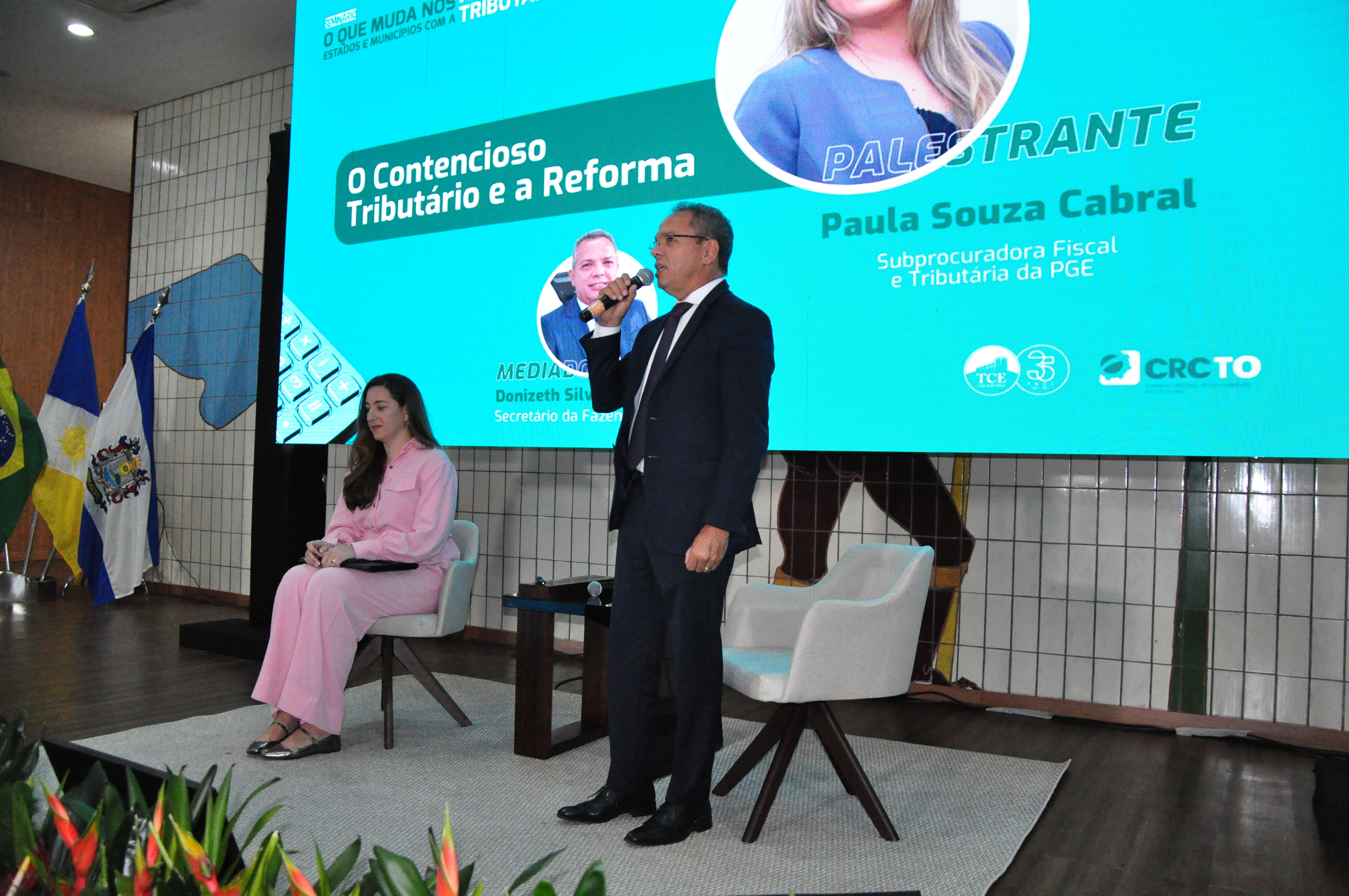 O secretário da Fazenda do Tocantins atuou como mediador na palestra "O Contencioso Tributário e a Reforma", apresentada por Paula Souza Cabral, Subprocuradora Fiscal e Tributária da Procuradoria-Geral do Estado (PGE). O evento fez parte da programação do Seminário "O que muda nos estados e municípios com a Reforma Tributária?", promovido pelo Tribunal de Contas do Estado do Tocantins (TCE-TO), na tarde desta quinta-feira, dia 29.