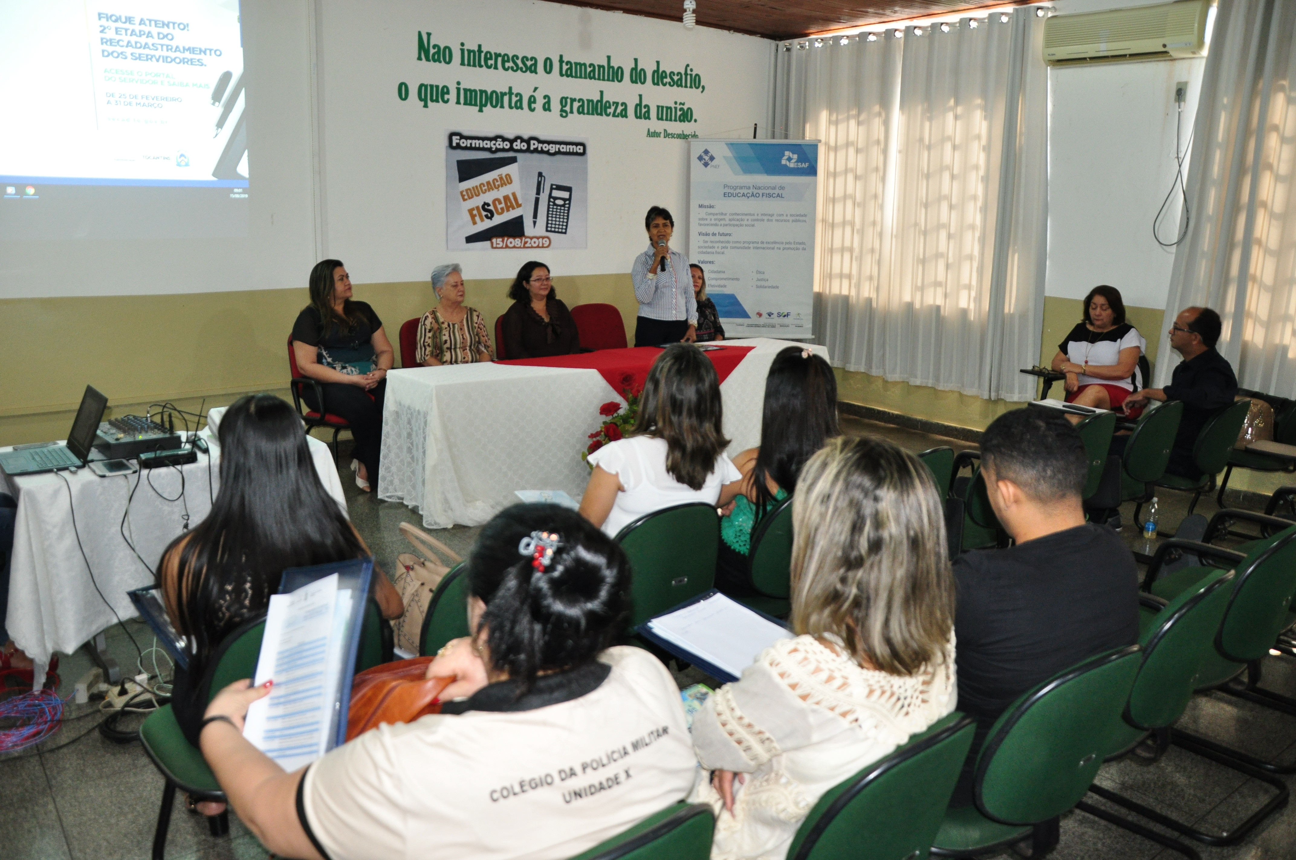 O evento é composto de palestras e oficina. Pela manhã aconteceram as palestras: ‘Apresentação dos Programas Nacional, Estadual e Municipal de Educação Fiscal’, ministrada pela coordenadora do Gefe Tocantins, Andreia Feitosa e Delvane Barros, membro do Grupo Tocantins; ‘Boas práticas em Educação Fiscal’, por Naiara de Aquino Miranda B. Souza; ‘O que é Cidadania no Currículo Escolar’, por Josiel Gomes dos Santos, gerente de Educação Profissional da Secretaria da Educação, Juventude e Esportes – Seduc.