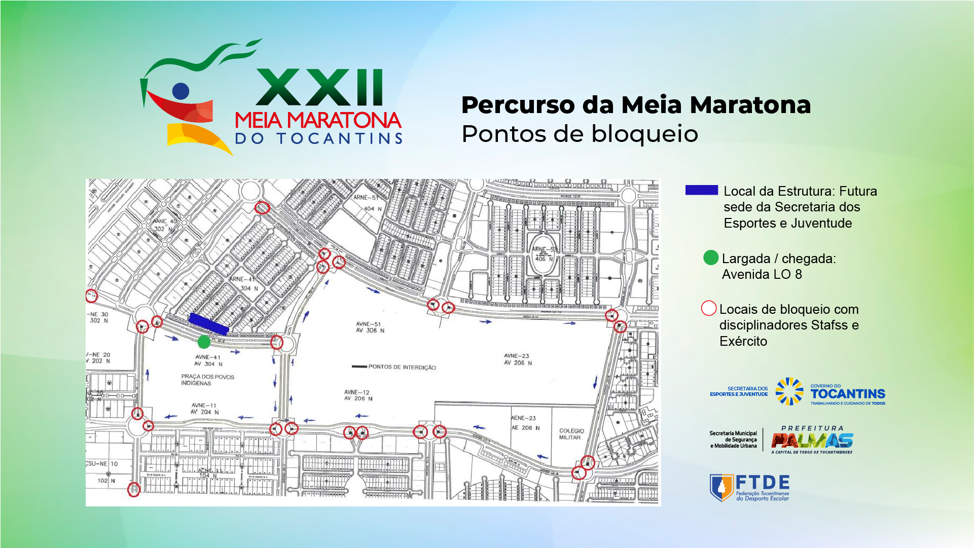 No próximo domingo (3), será realizada a 22ª edição da Meia Maratona do Tocantins. Para garantir a segurança dos 1.200 atletas confirmados nas provas, além das equipes técnicas e staffs que estarão trabalhando no evento, as avenidas no entorno do Parque dos Povos Indígenas e do Colégio Militar, em Palmas, serão parcialmente interditadas. As interdições iniciam às 5h e seguem até às 12h30.